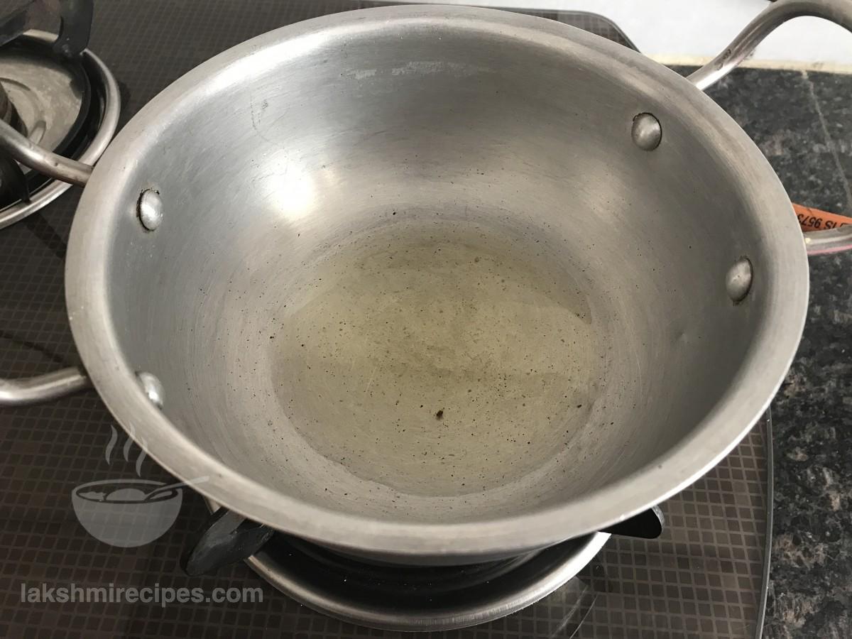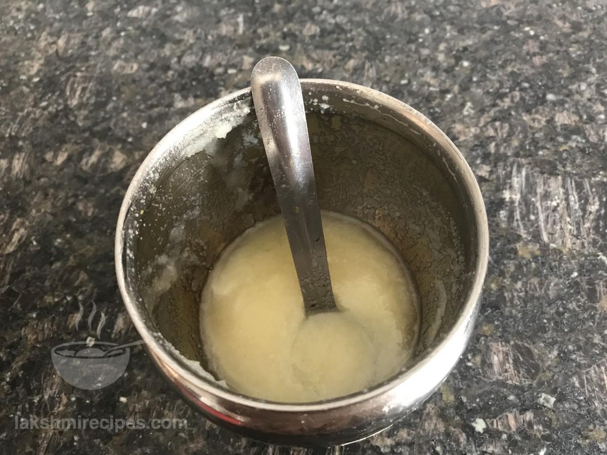 - अब एक बड़े और मोटे आधार वाली कढ़ाई को गरम करें और इसमें 1 बड़ा चम्मच घी डालें।
