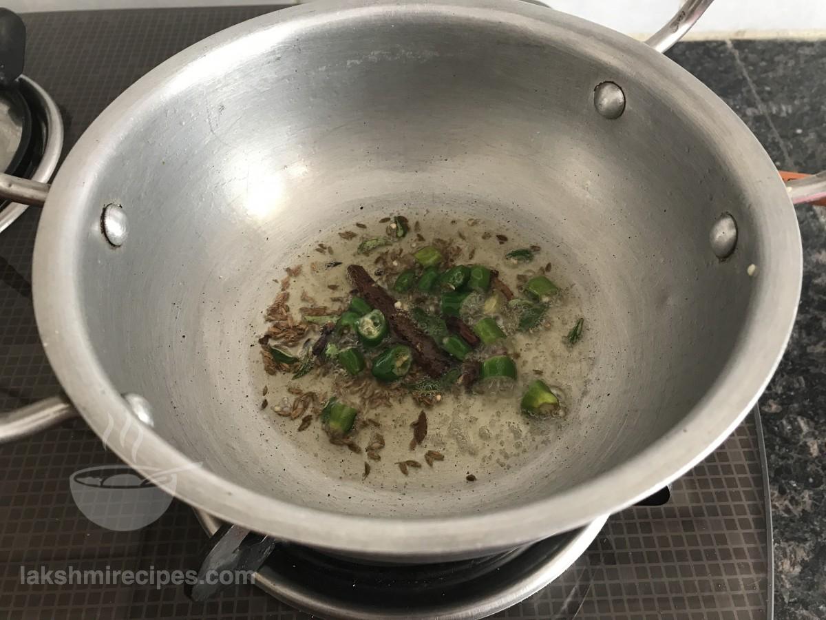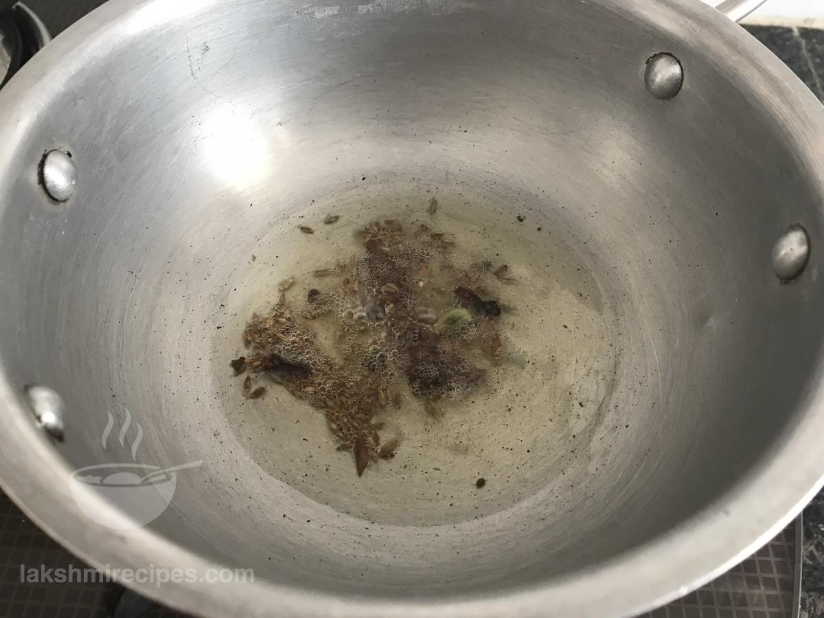 - जब घी पर्याप्त गरम होजाए तो फिर इसमें जीरा, लौंग, छोटे इलायची और दालचीनी डालें।