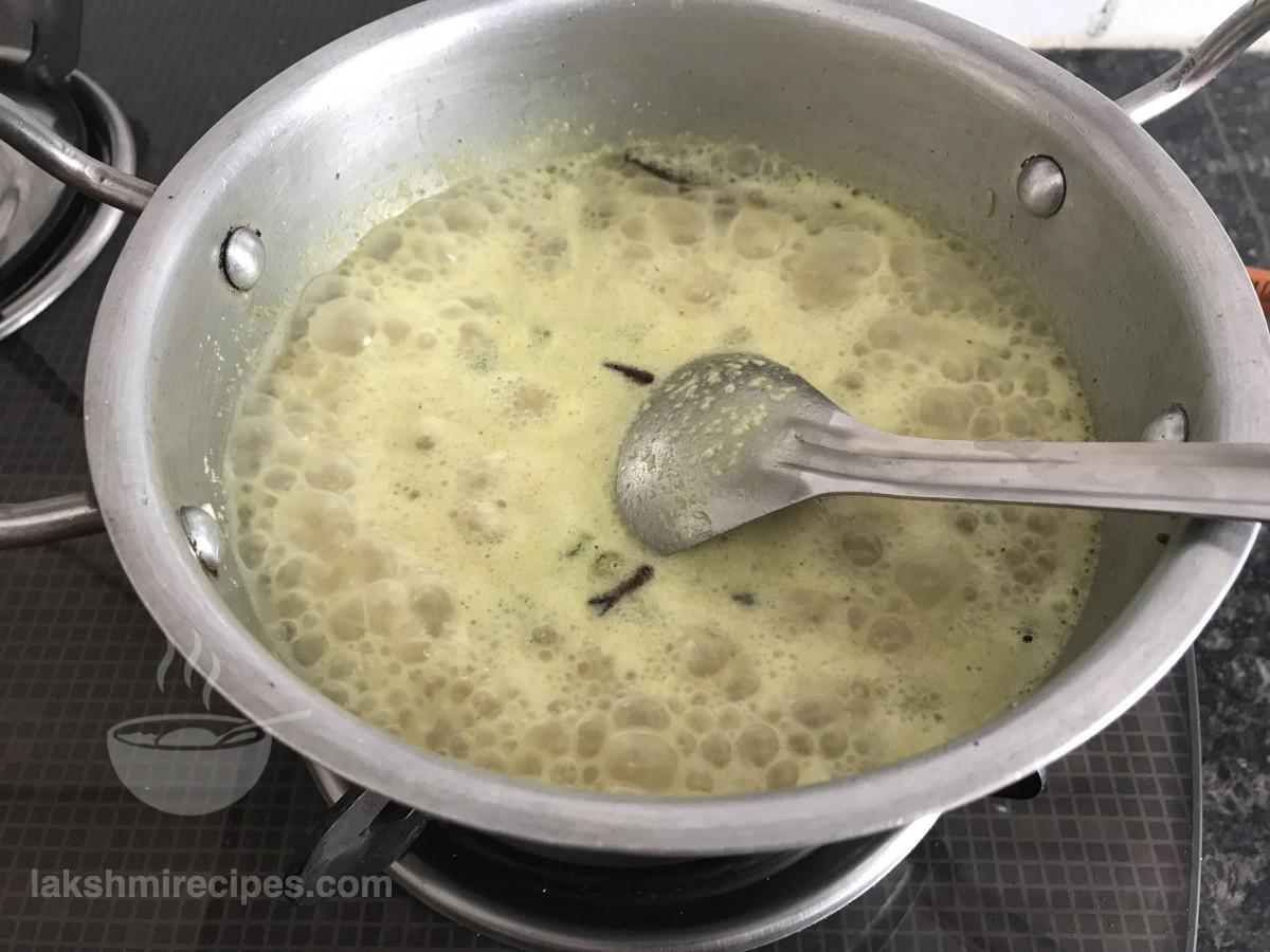 - 1 मिनट के लिए चावल को चलाते हुए भूनें। इसके बाद कढ़ाई में नारियल का दूध डालें। अच्छी तरह से फिर से मिलाएं।