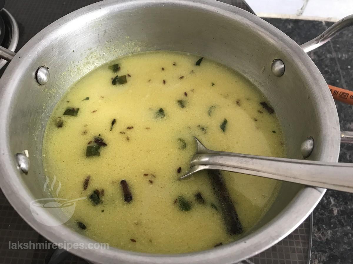 - अब कढ़ाई में पानी डालें और आंँच को मध्यम स्तर तक कम करके सामग्री को पकने दें।