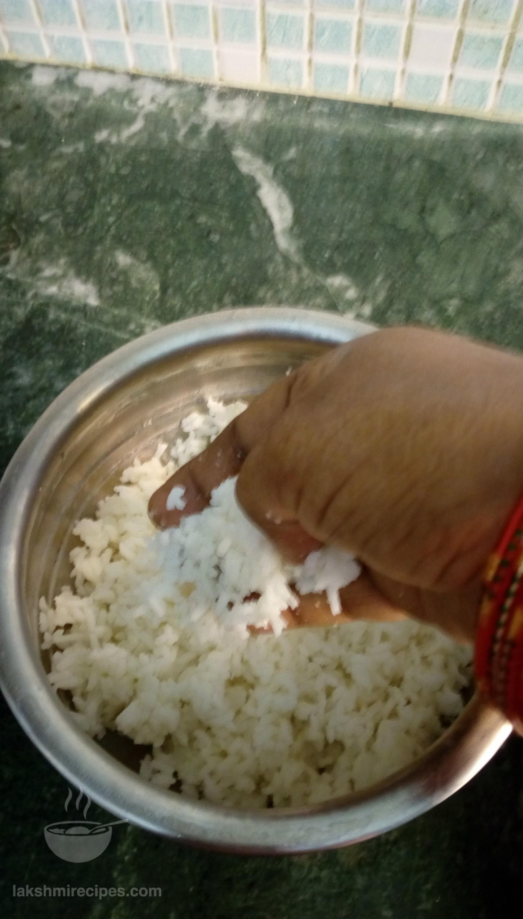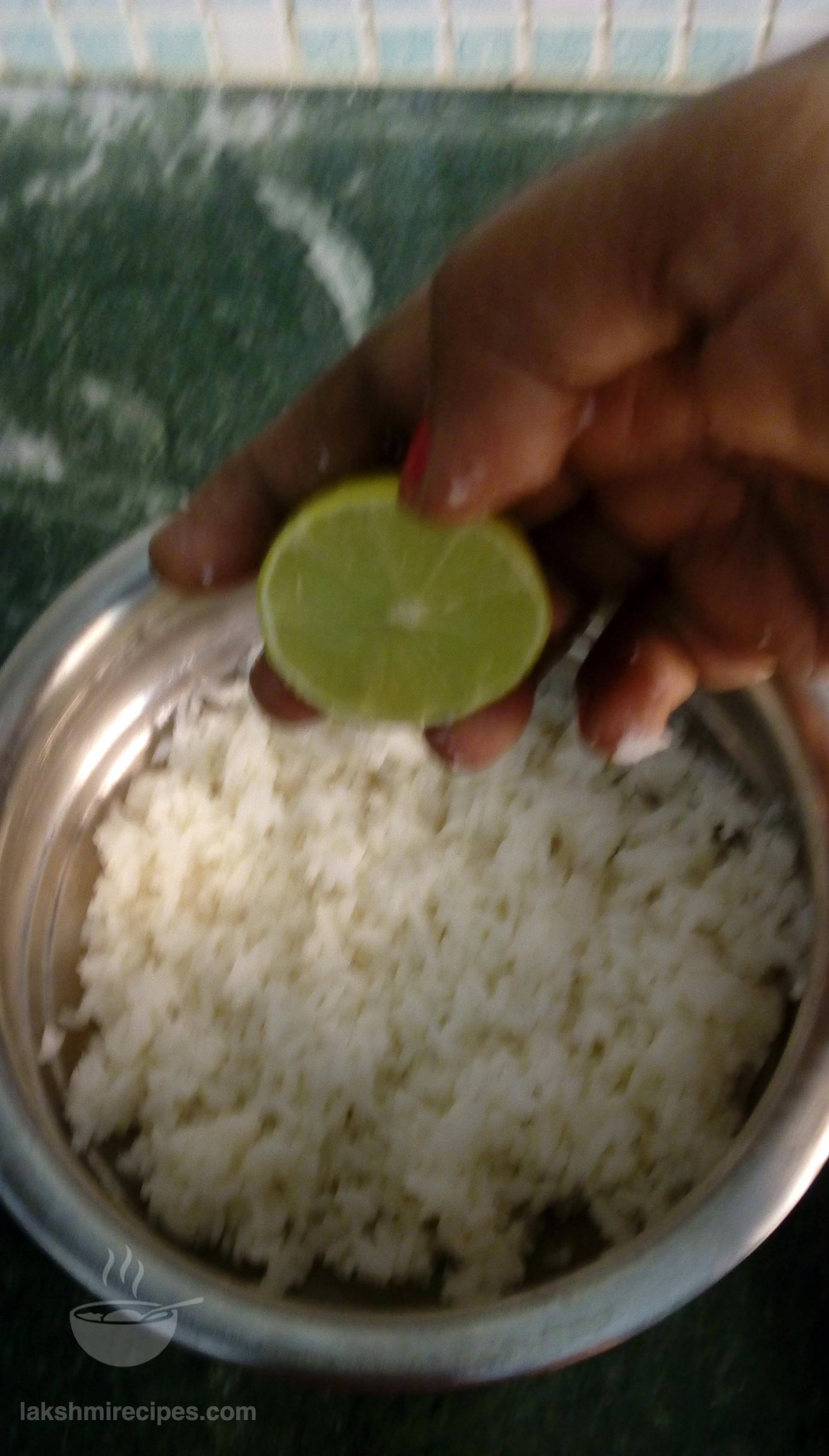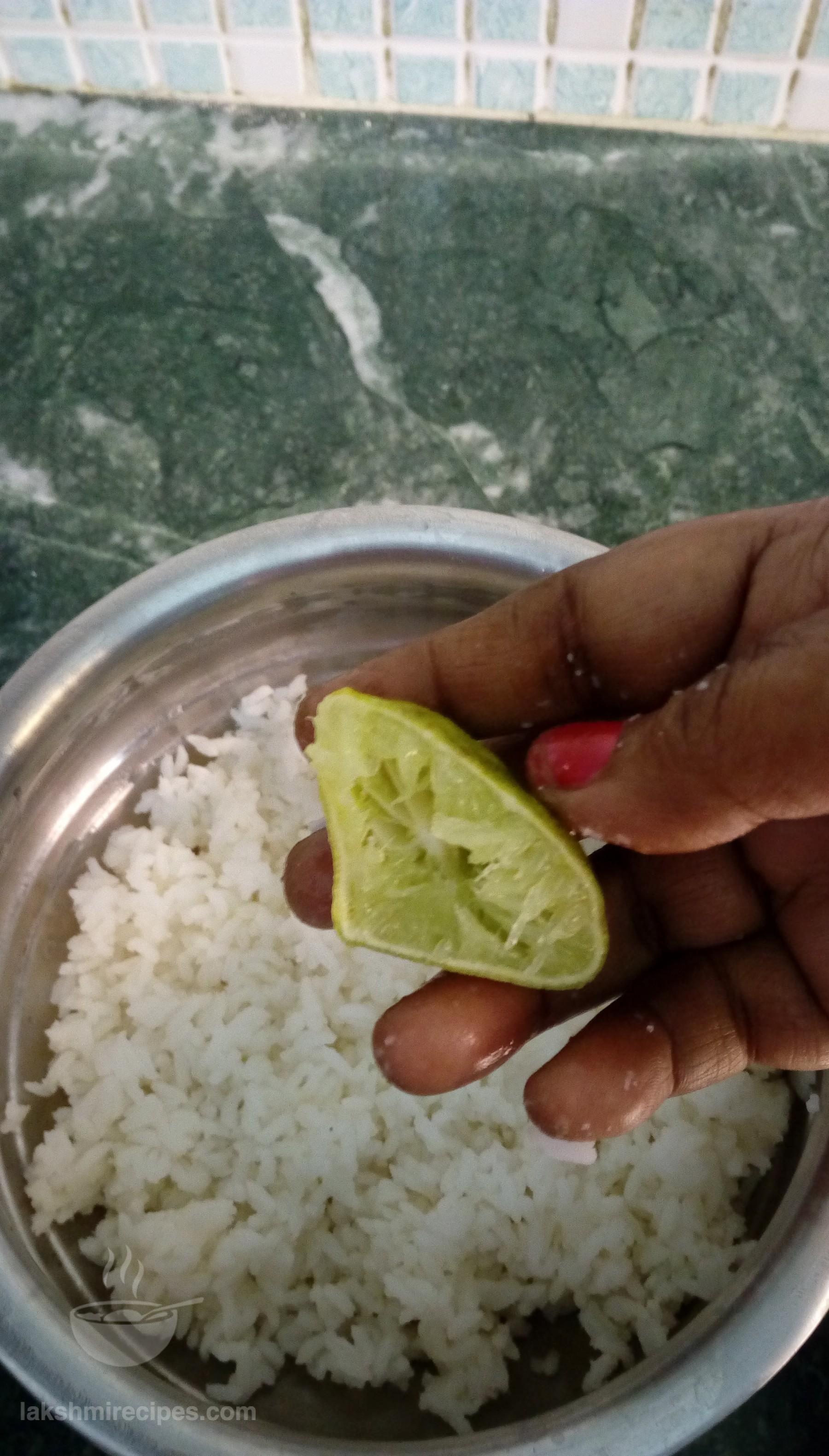 - Take the boiled and cooked rice (paka hua chawal) in a deep mixing vessel and lemon juice squeezed from 1/2 of a medium sized lemon. Then mix it well with the rice with hands.