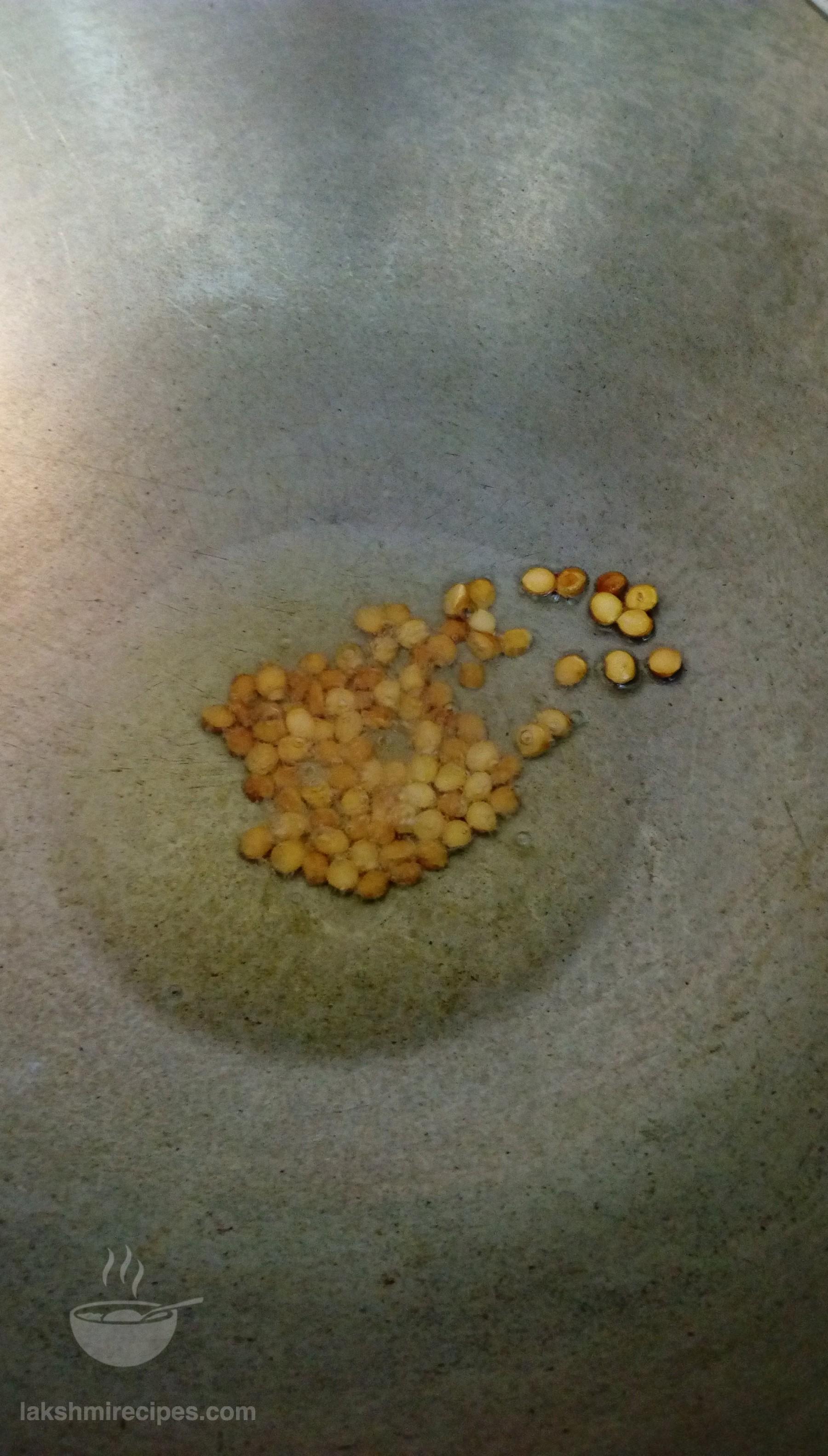 - Now roast the split Bengal gram (chana dal) till it turns cripsy and red and transfer it too, to a plate to be used later.