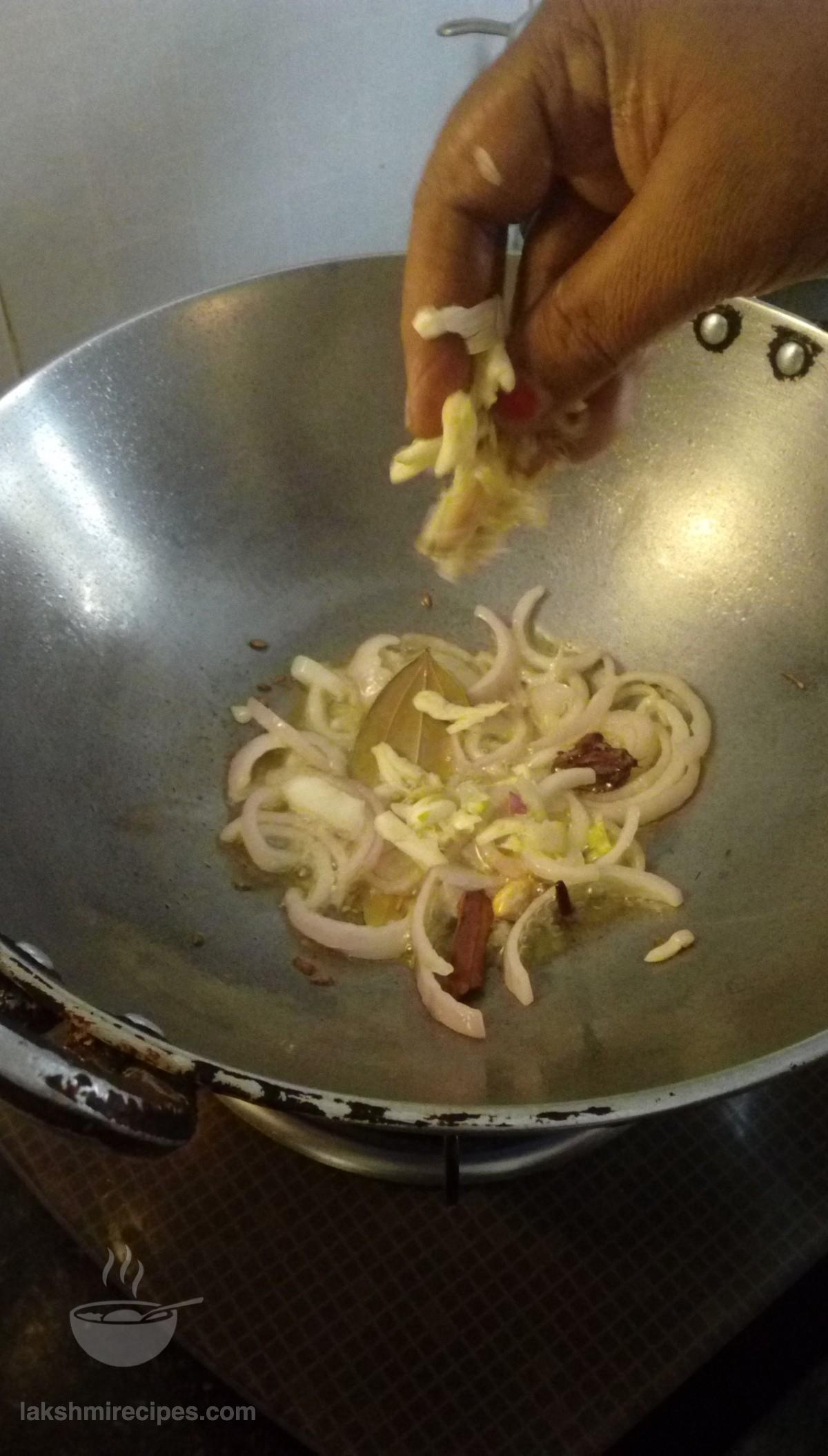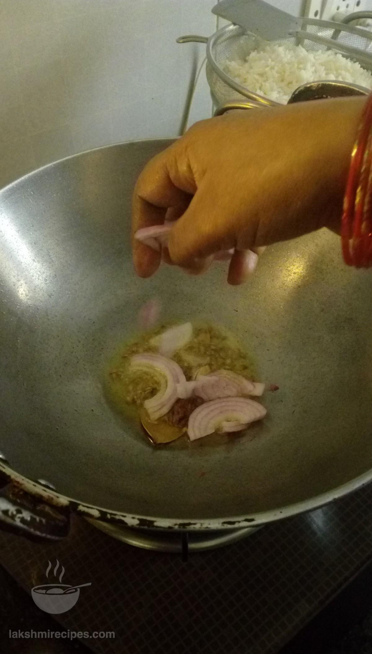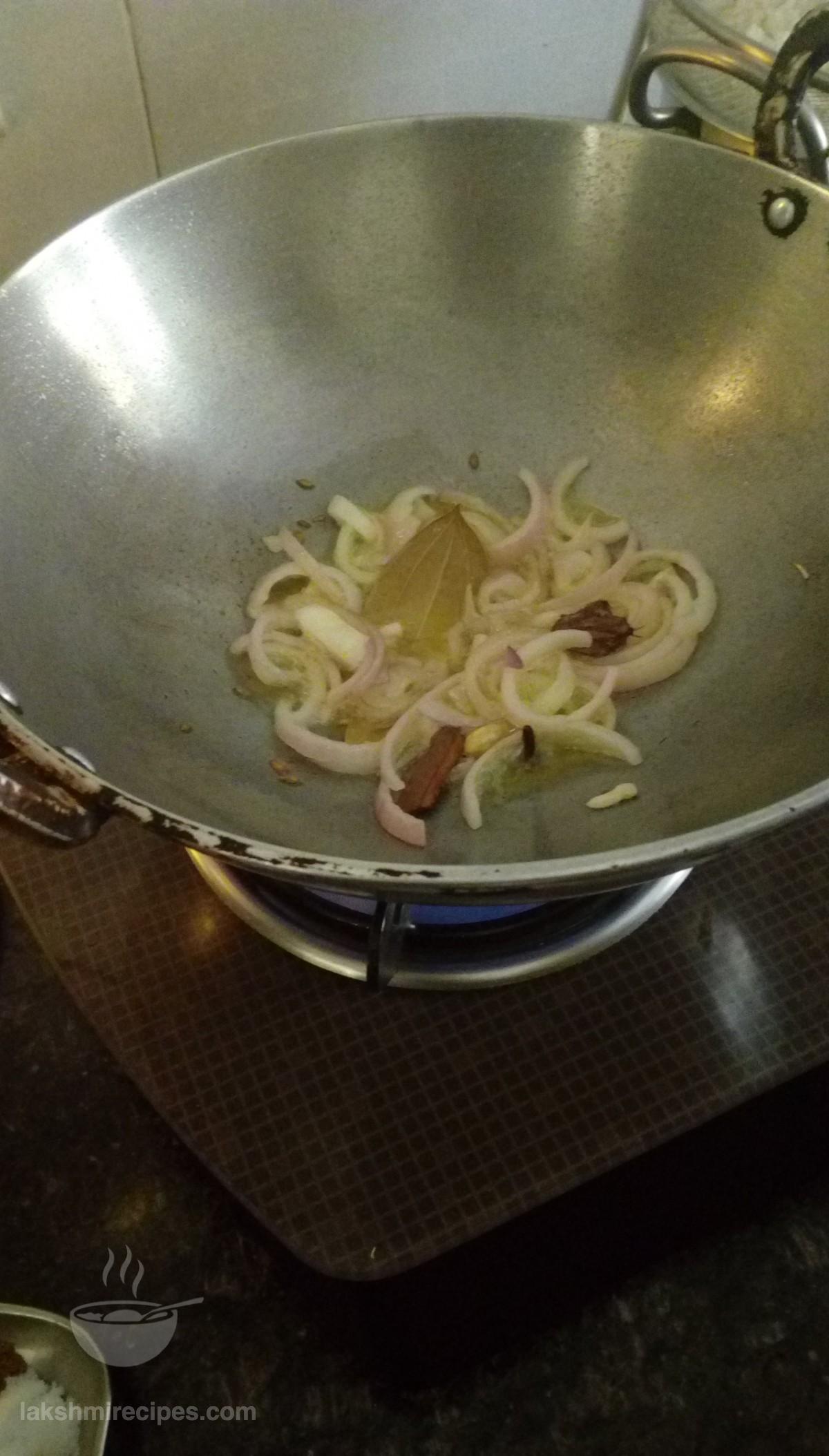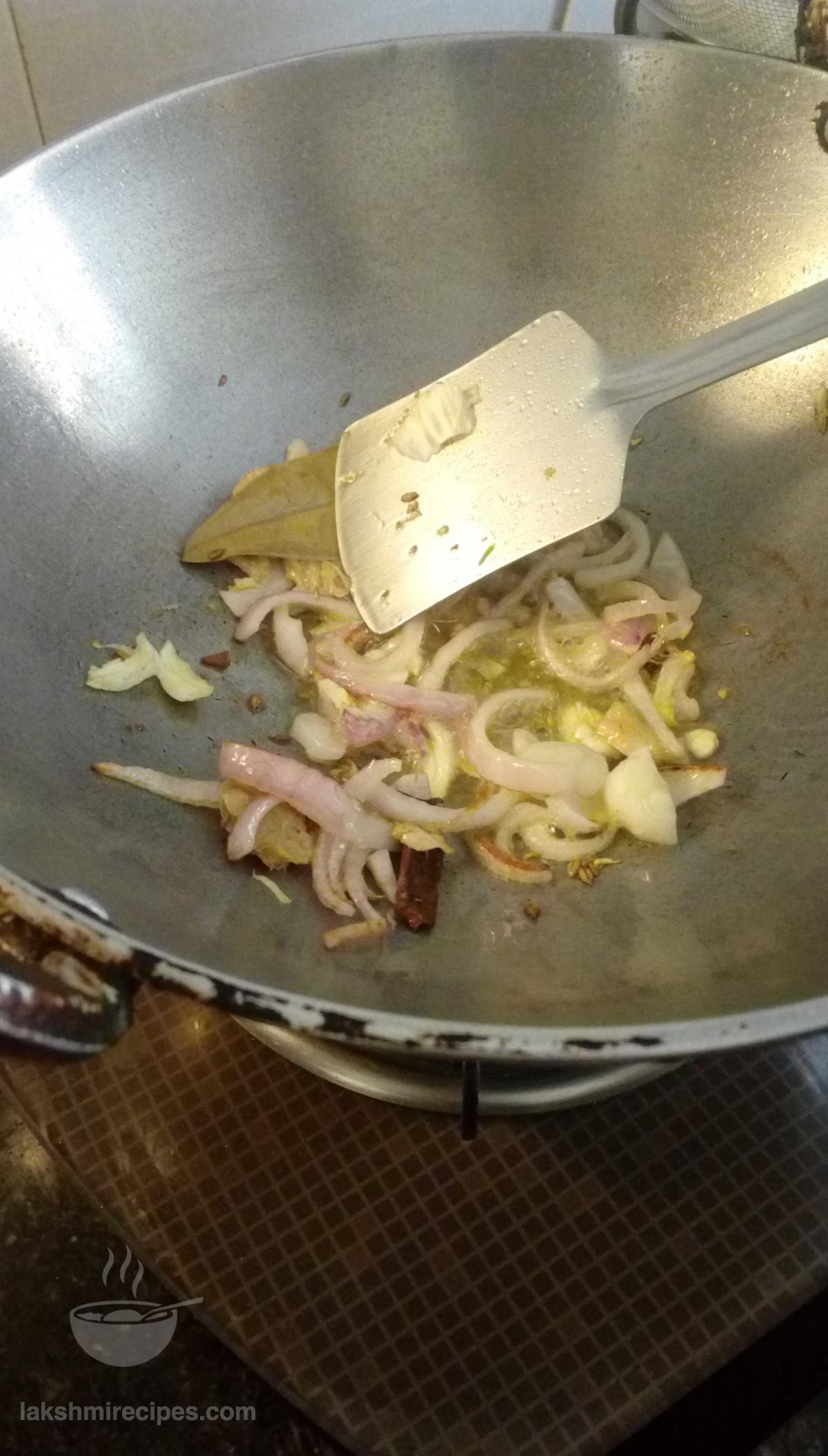 - Then add finely chopped onion to it and stir to saute the onion with the whole spices. Saute the chopped onion slices till they turn light red in color.