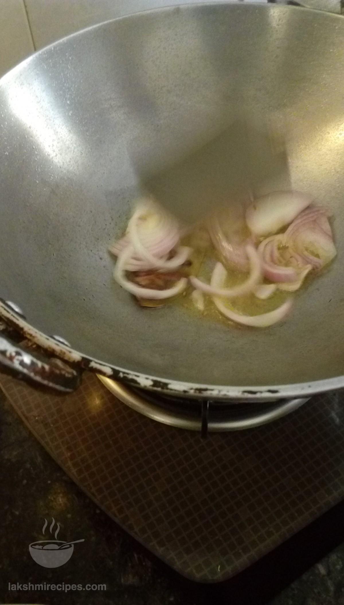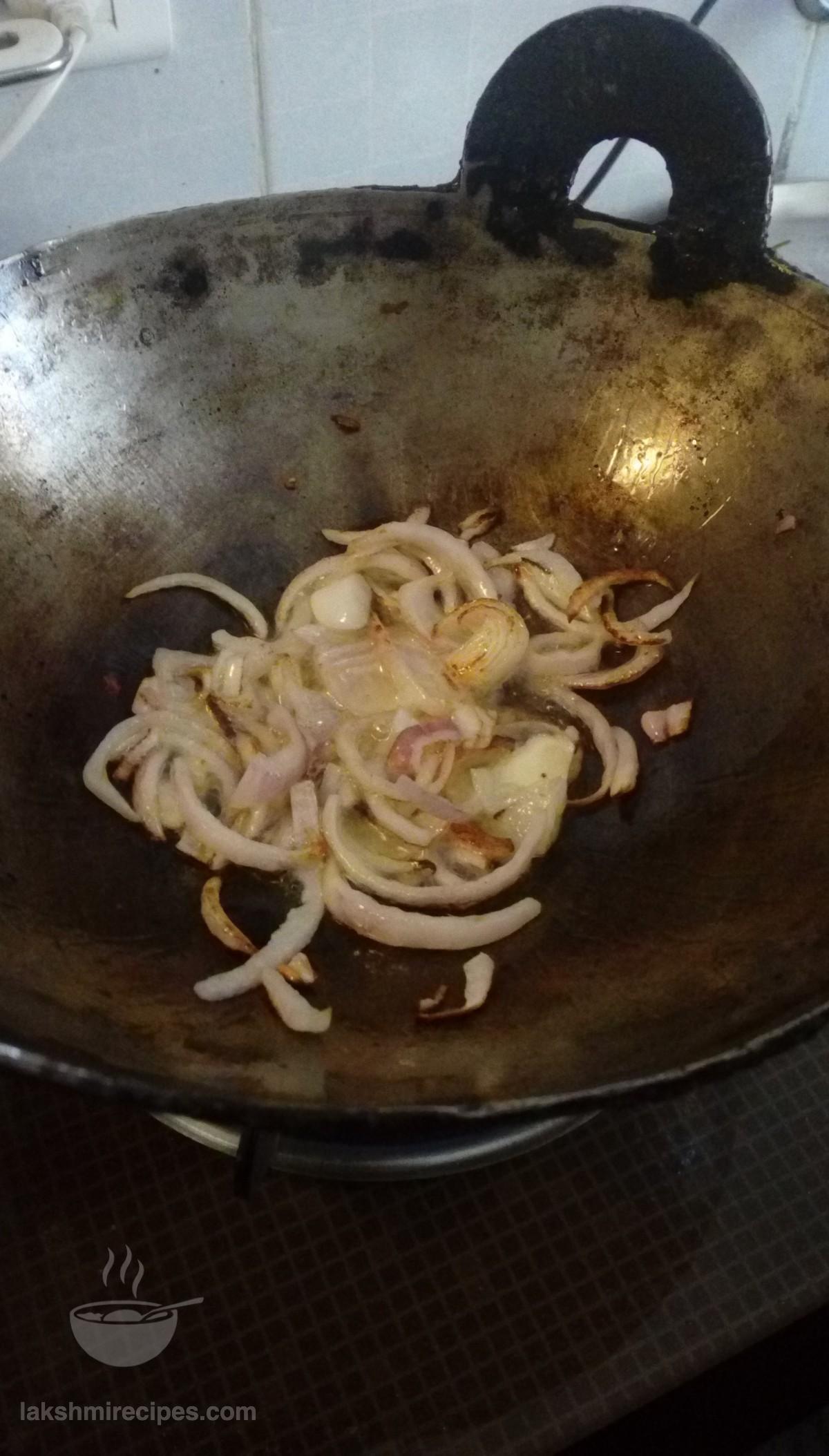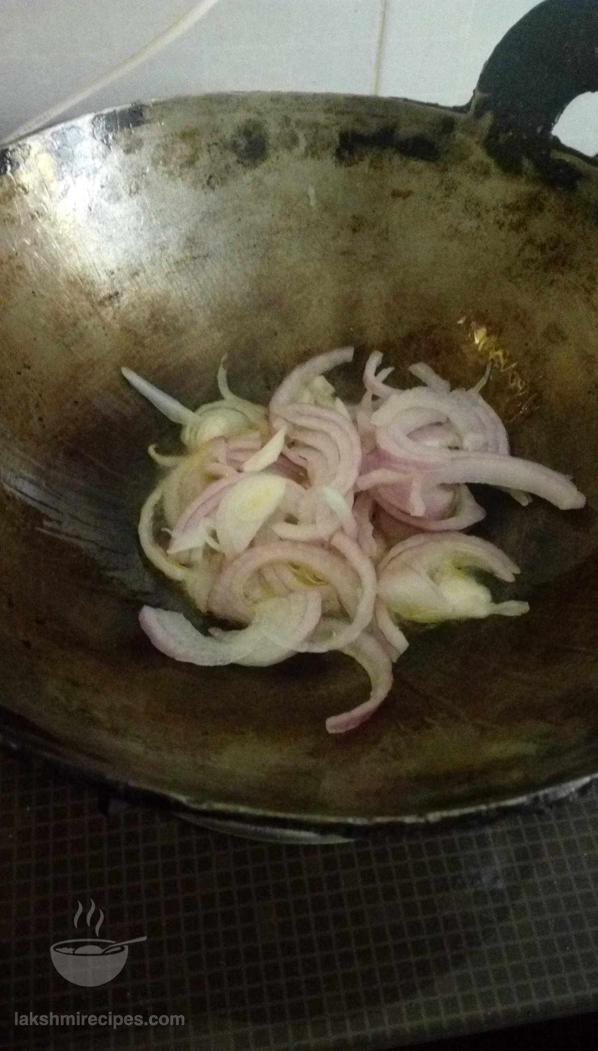- Again in the same kadhai add the finely chopped slices of onion and fry them until they turn nice golden brown in color. Then remove to a plate to be used later.