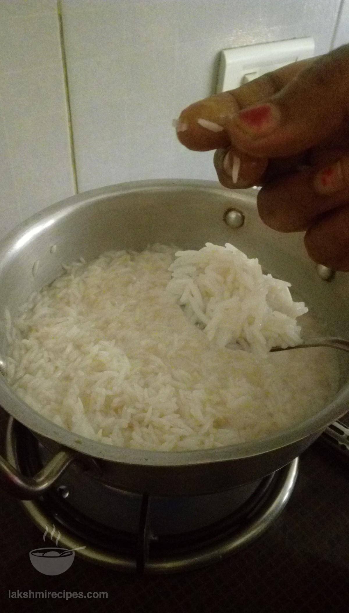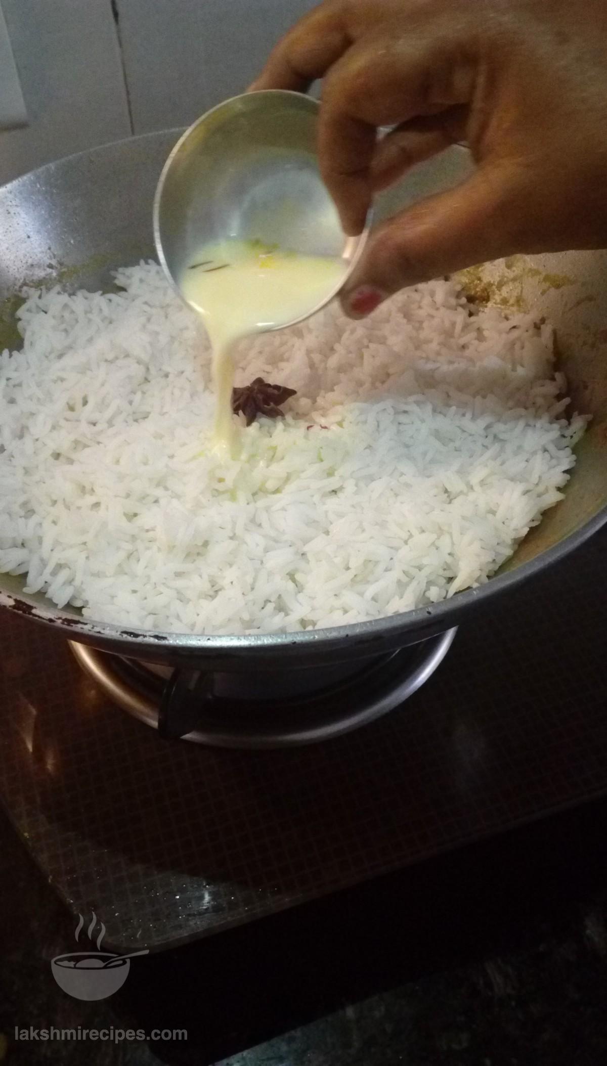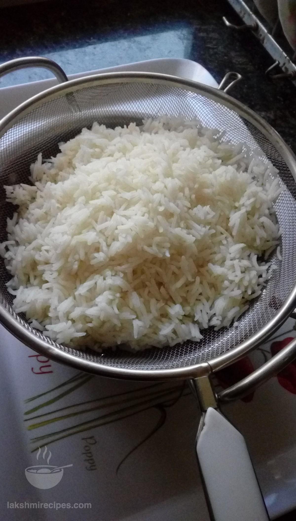 - Add caraway seeds and 1/2 tea spoon ghee to the vessel and lower the flame. Stir the cooking rice at regular intervals and cook it till 80%. Then turn off the flame. Strain of the water from the rice in which it was cooking with the help of a big colander or sieve.