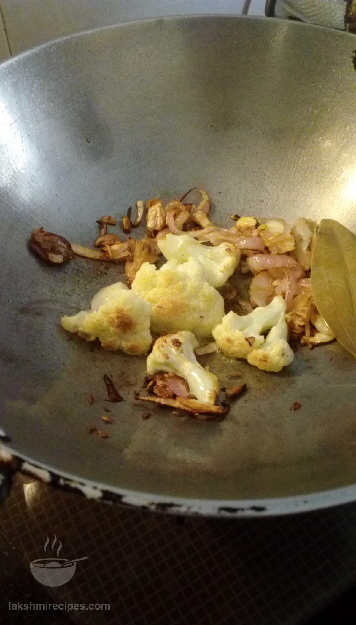 - Then add cauliflower florets to the kadhai and saute them till they become a little soft and golden red in color.