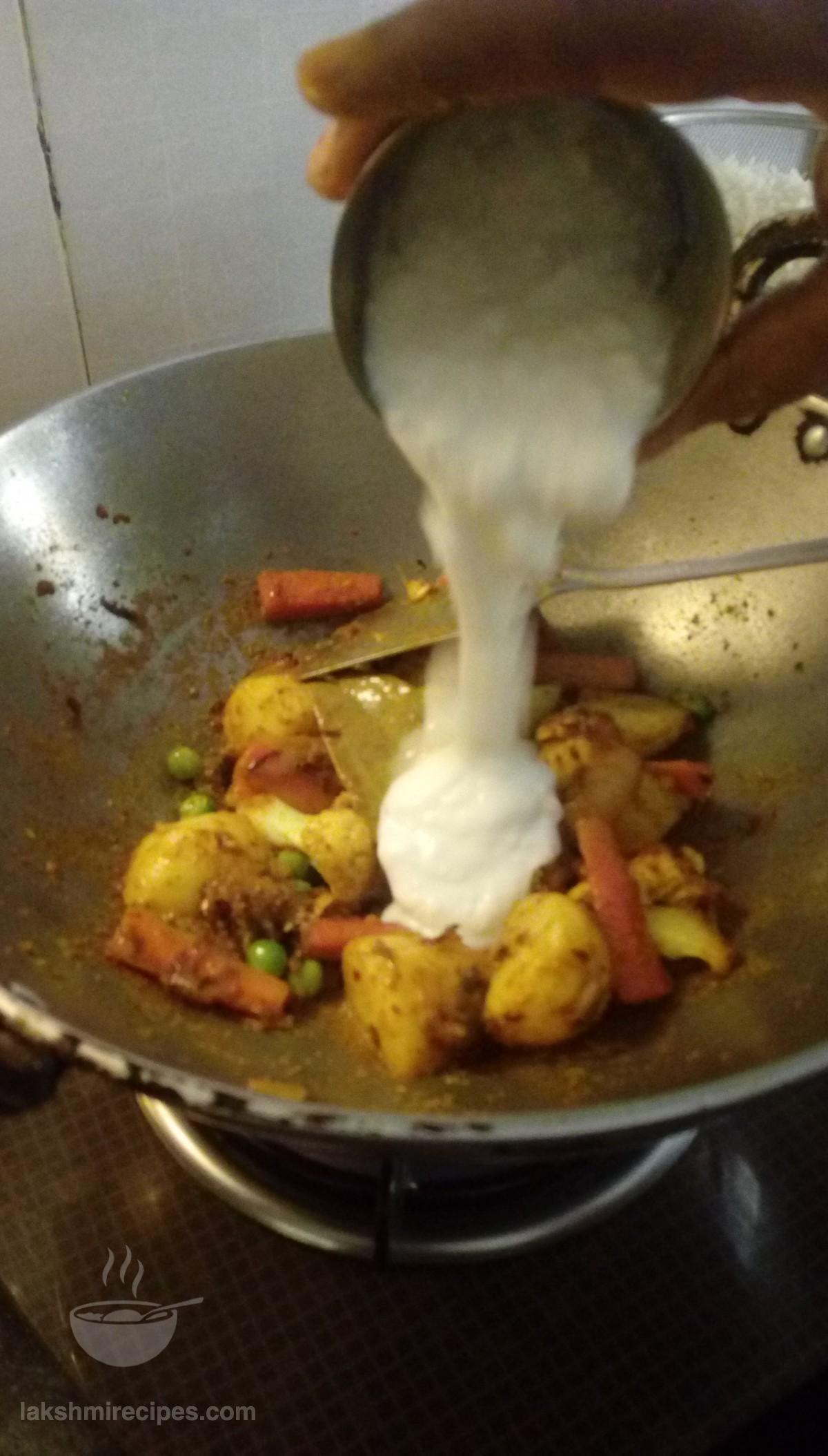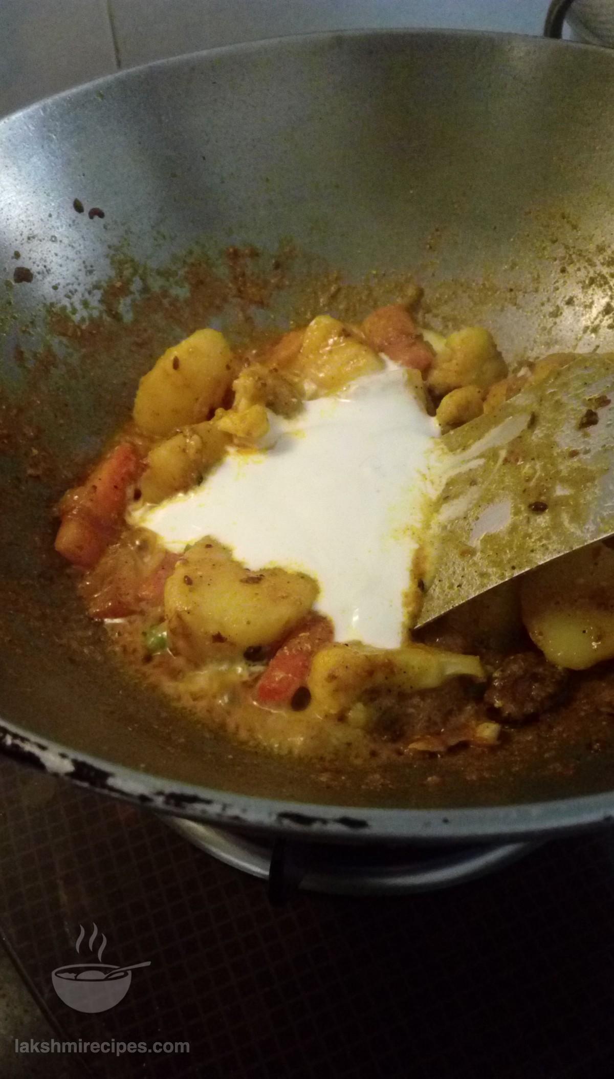 - अब कढ़ाई को दही डालें और मसालों के साथ समान रूप से मिश्रण होने तक अच्छी तरह मिलाएं।