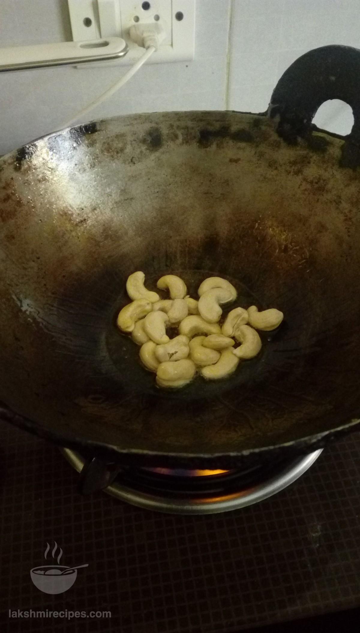 - Then in the same kadhai add some cashews and saute them till they turn golden brown in color. Then transfer them to a plate to be used later.