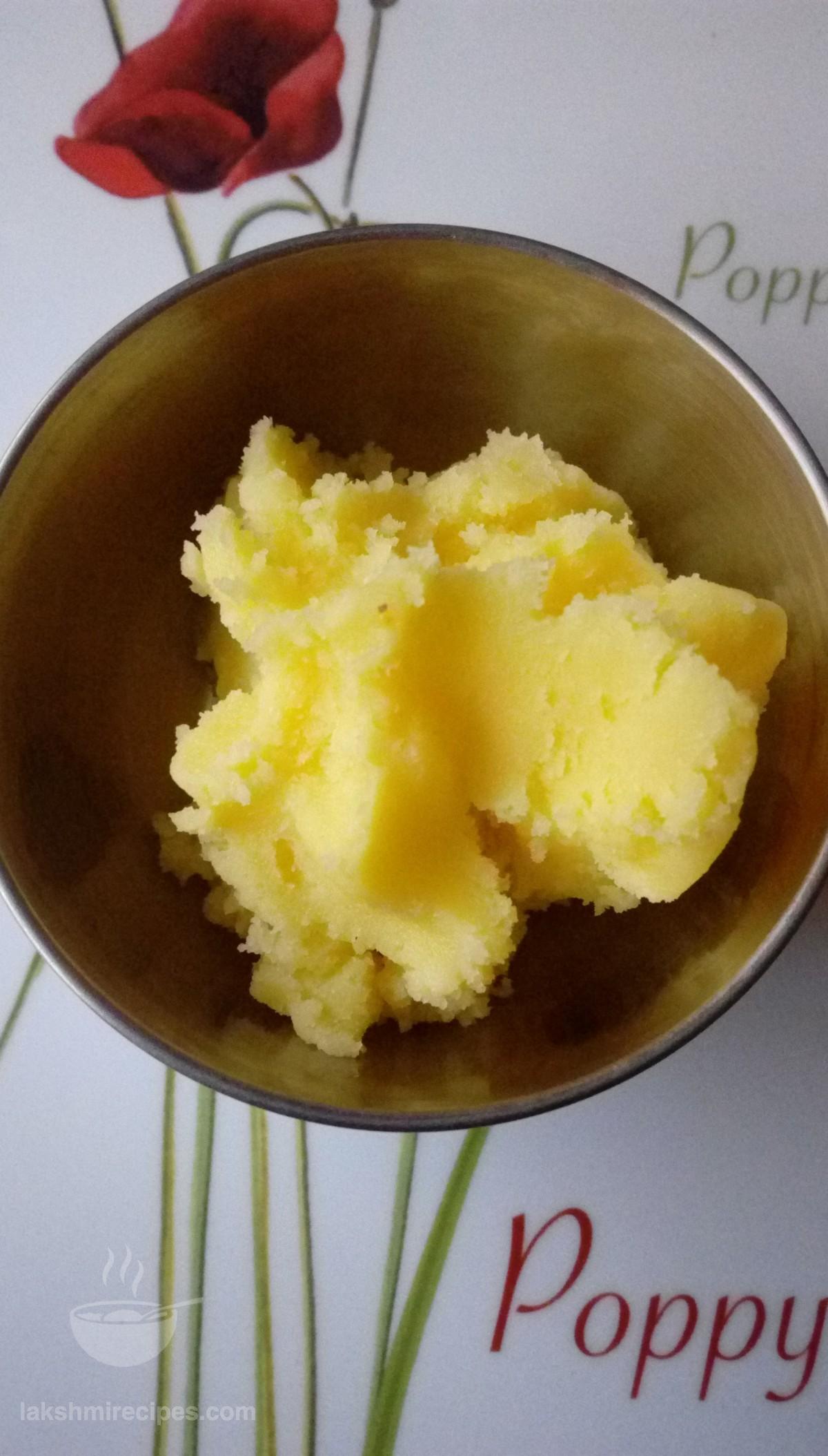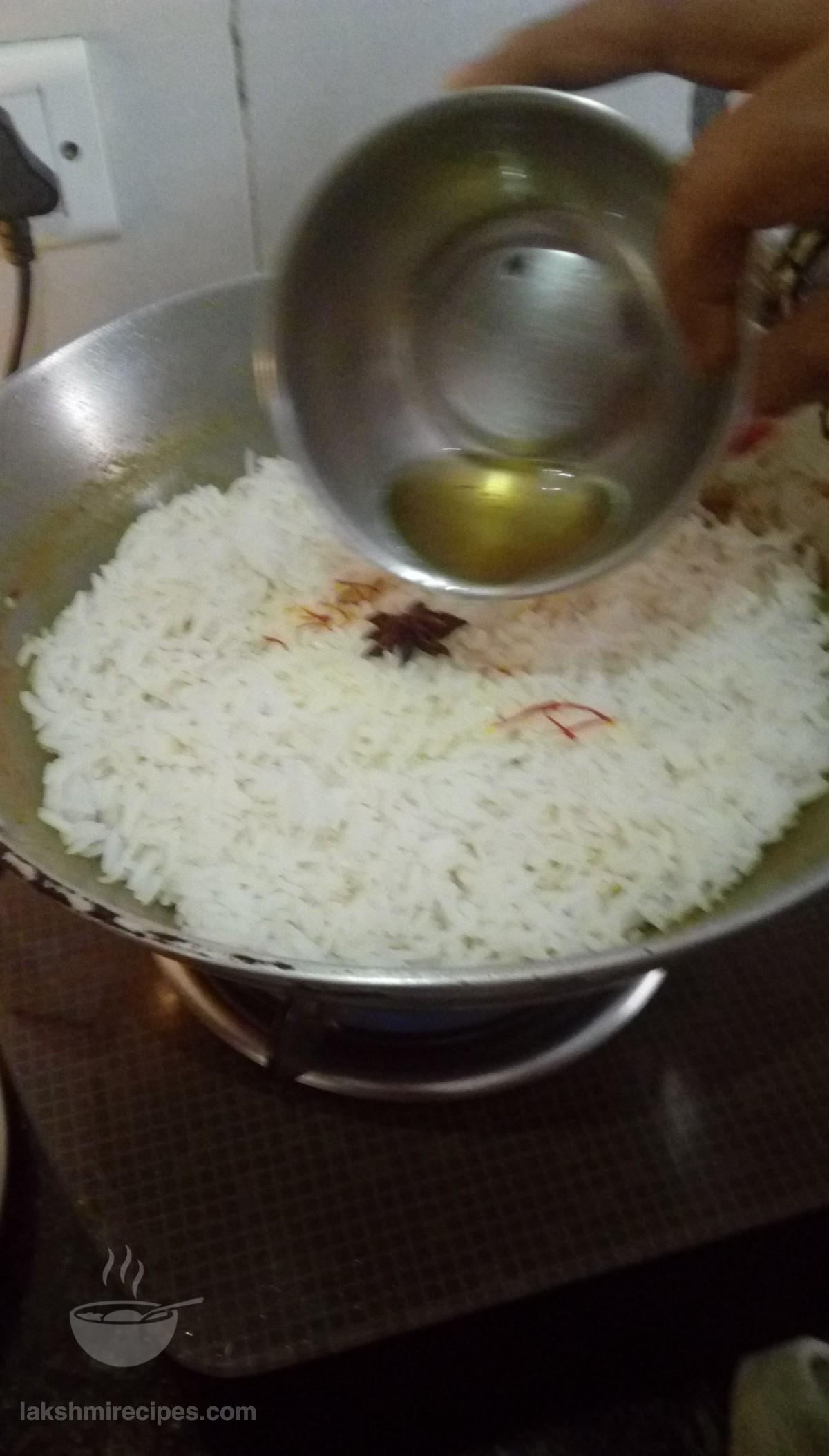 - Pour the milk in which saffron was soaked over it and then pour 1/2 small cup ghee over it.