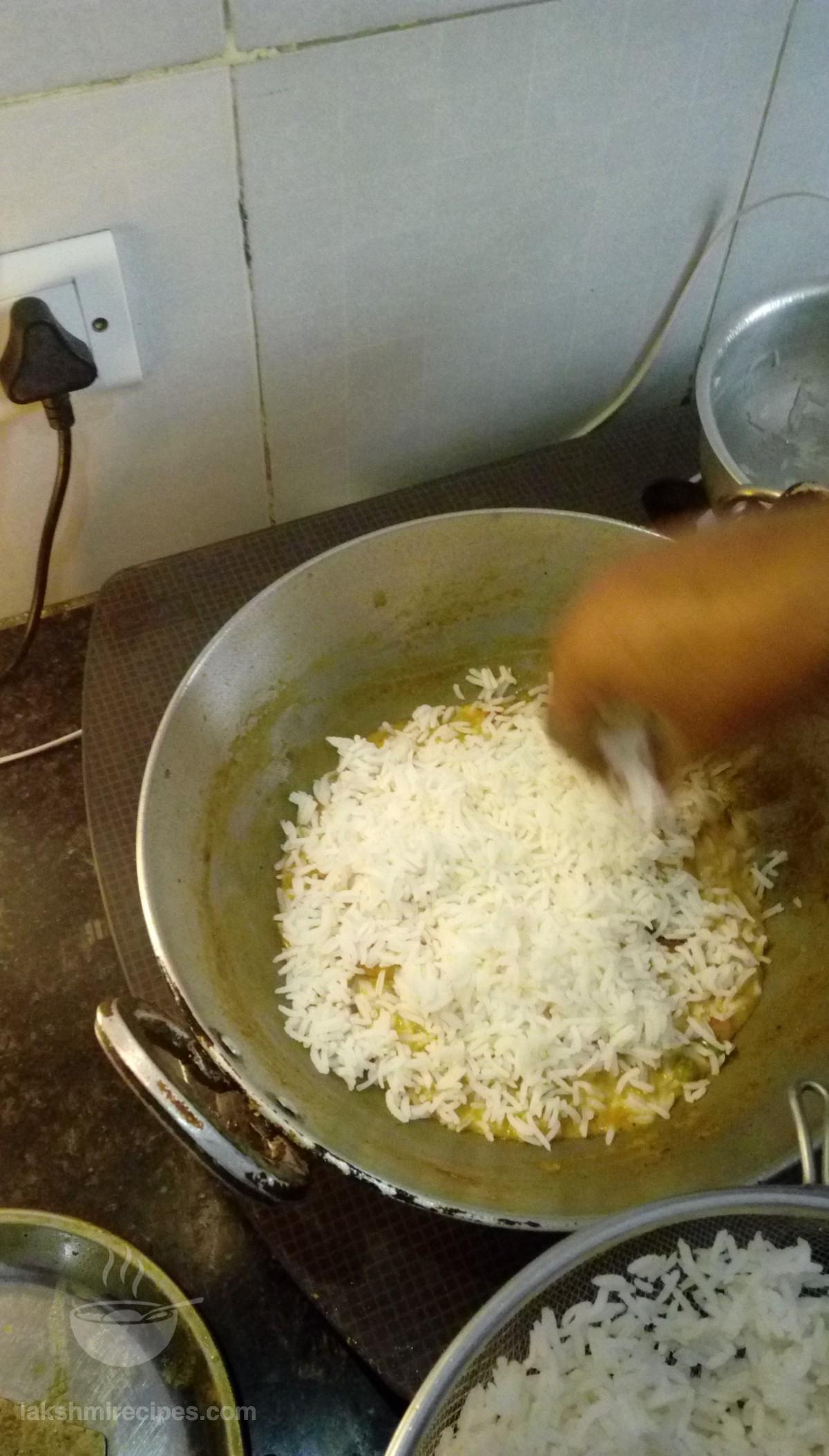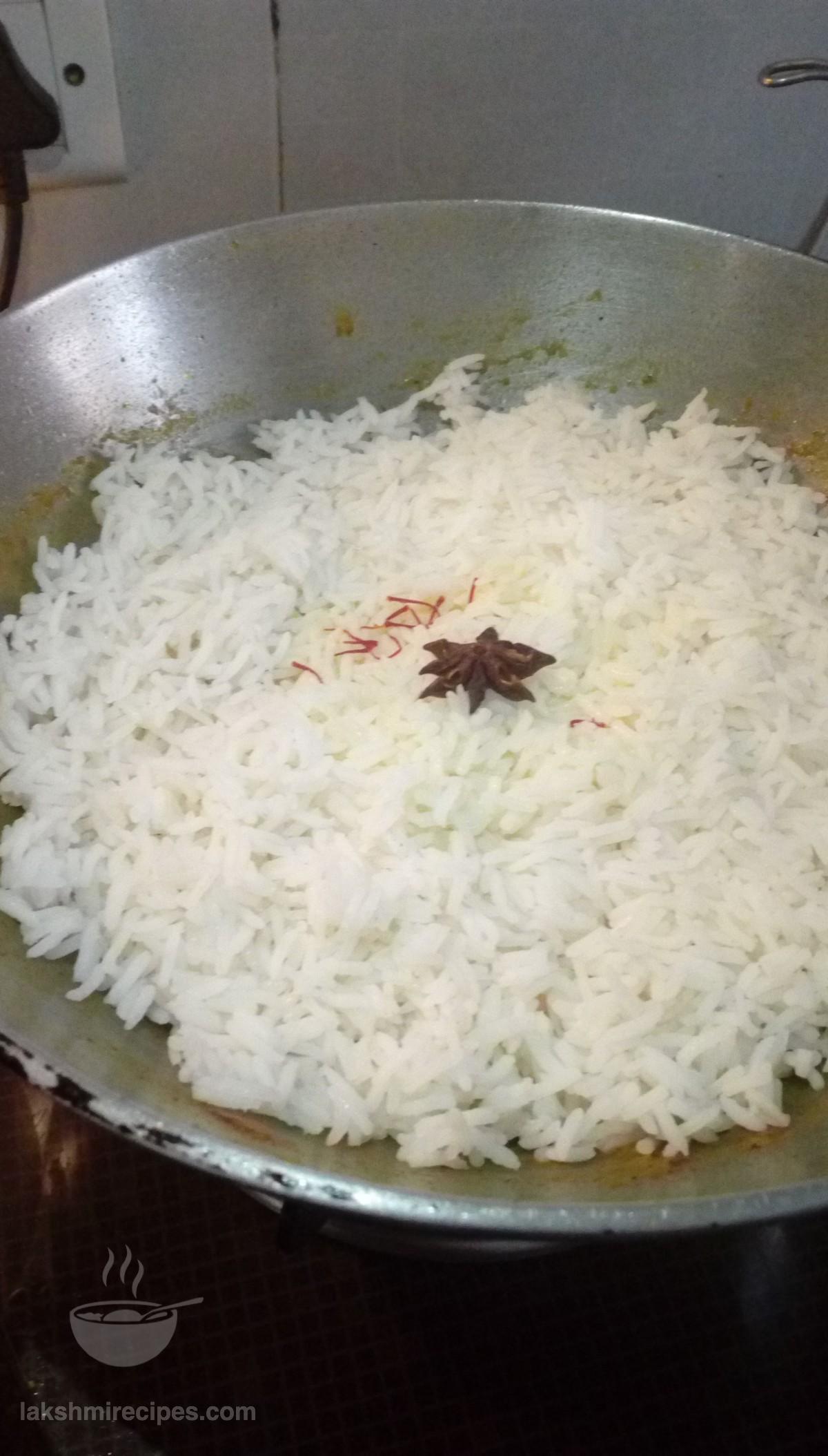 - अब तक सब्जियां 80% तक पक चुकी होंगी। सब्जियों को थोड़ा दबाकर देख लें और जब कढ़ाई में थोड़ी ग्रेवी बची हुई हो, तब इसमें आंशिक रूप से उबले हुए चावल डालें। चावल की एक समान परत बनाने के लिए समान रूप से चावल को फैलाएं।