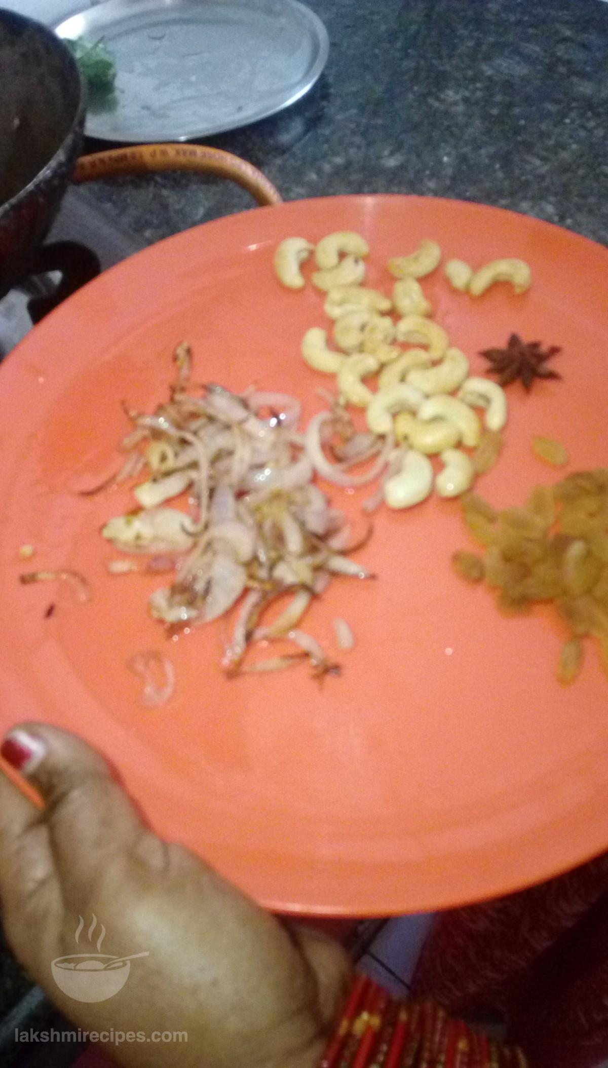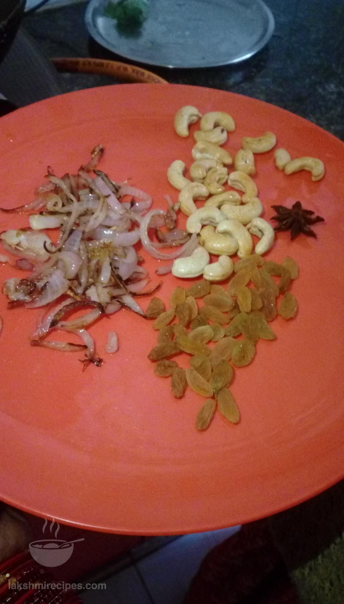 - Garnish it with fried onion slices, coriander leaves, cashews and raisins and serve hot.