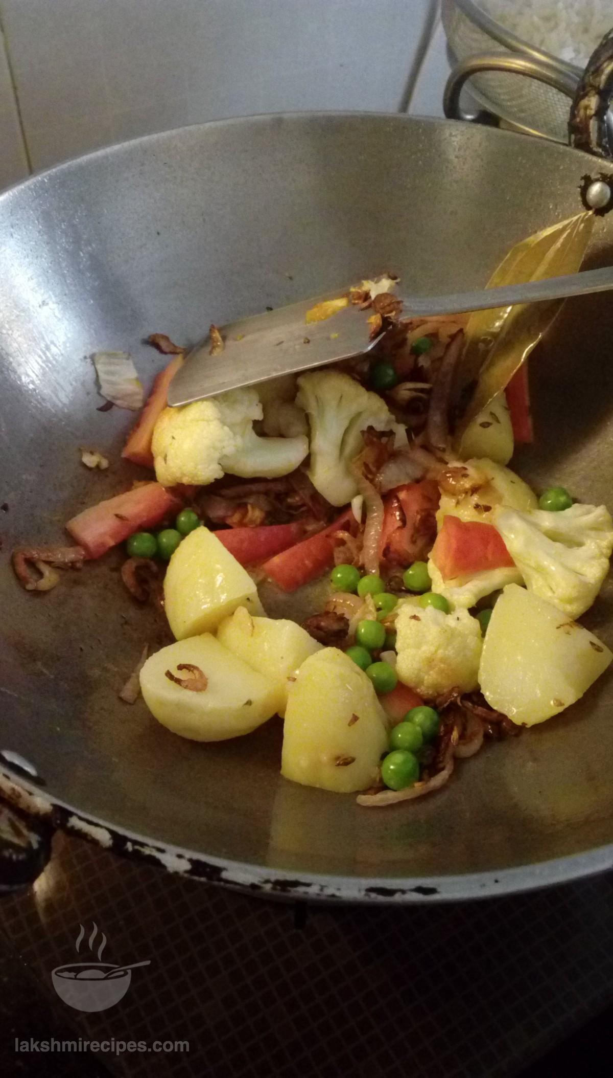 - Now add carrot pieces, green peas and pieces of boiled potato to the kadhai. Stir to mix with the other ingredients.