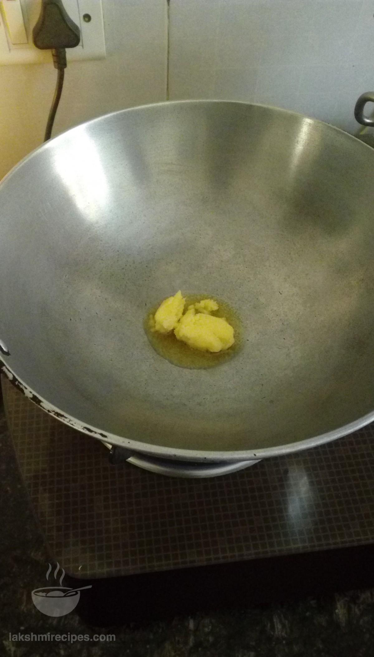 - Now take a heavy based kadhai and heat 1 table spoon ghee in it.