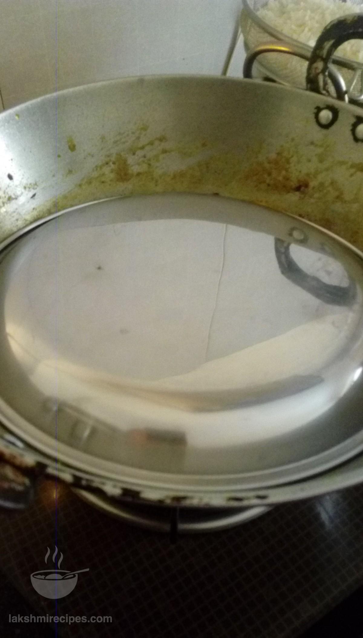 - Cover the kadhai with a heavy lid or place something heavy over the lid, to prevent the steam from escaping. Cook the biryani in this manner for 10 minutes over low flame only.