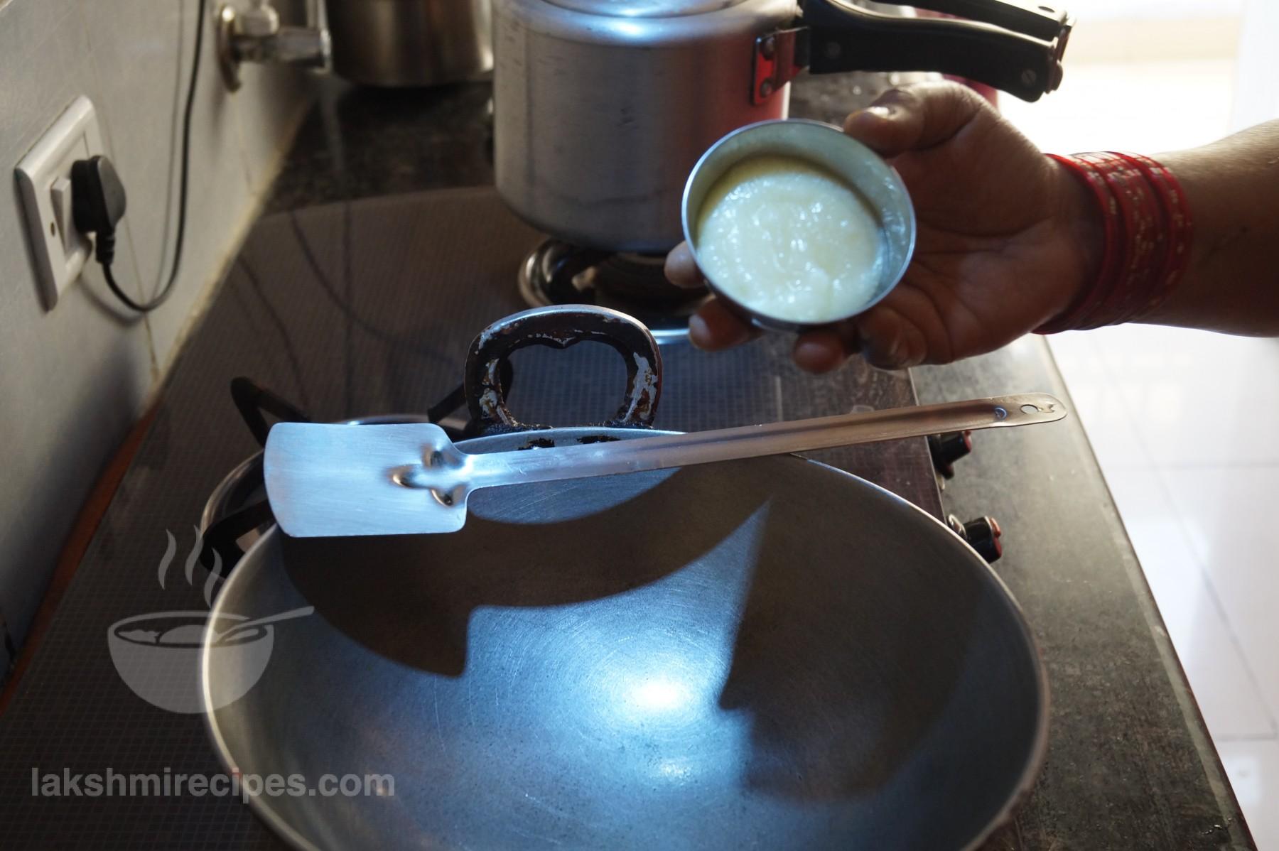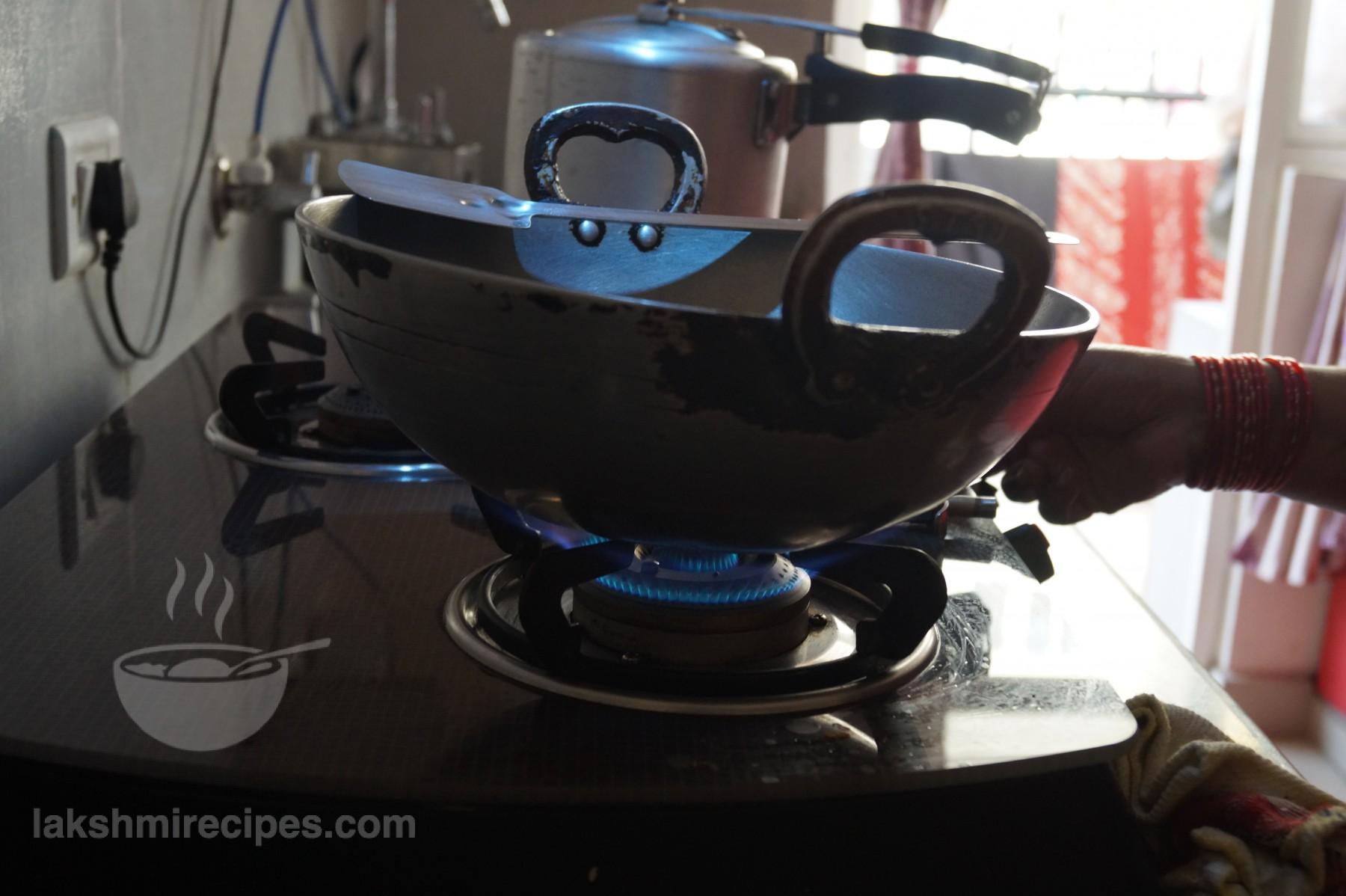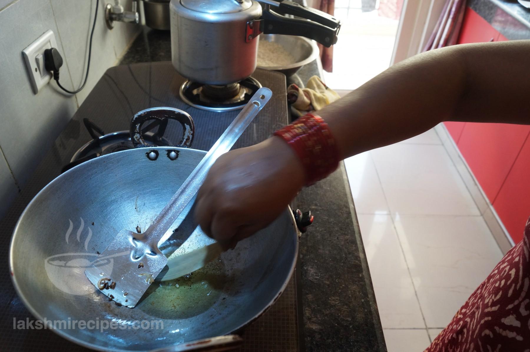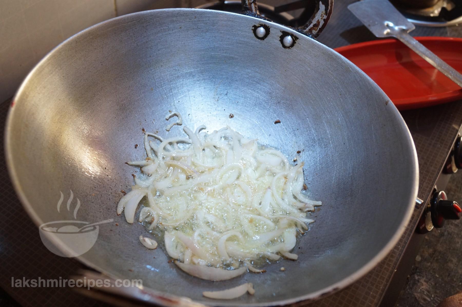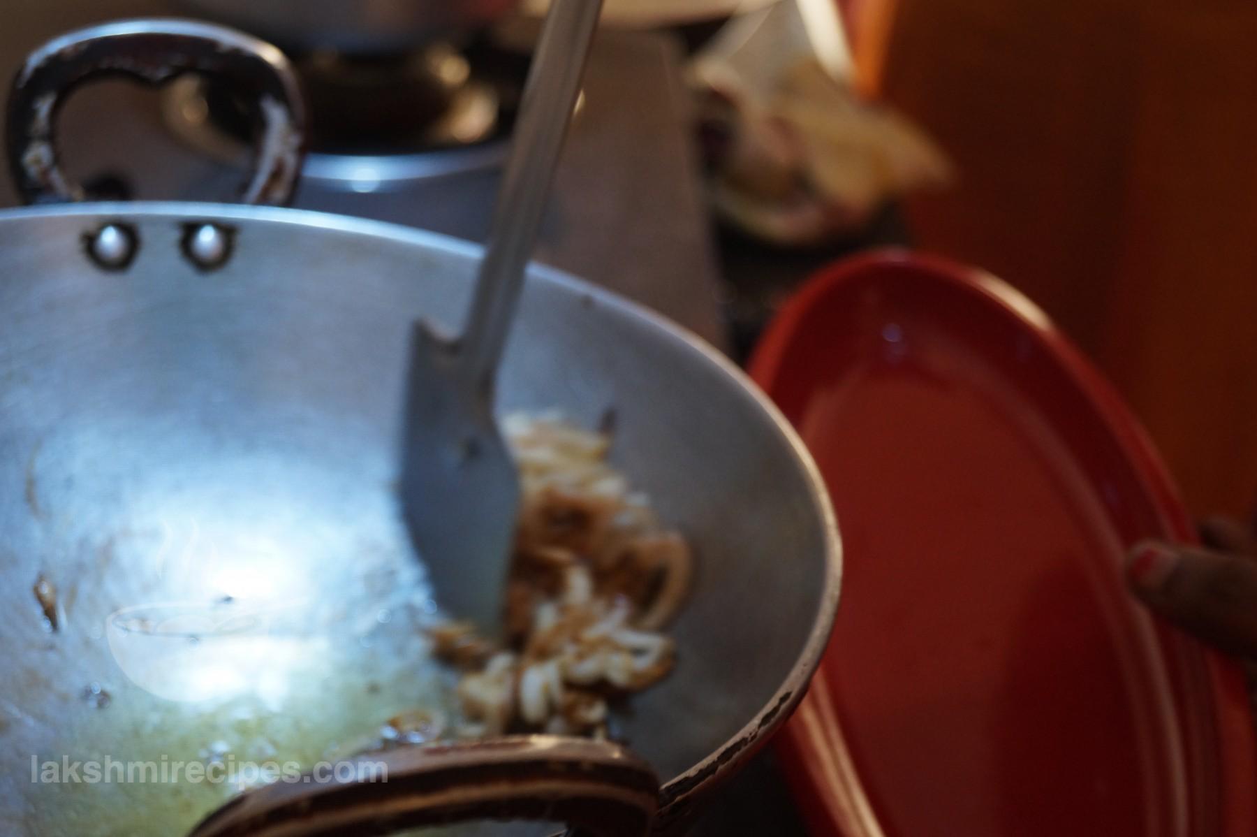 - Heat some ghee in a kadhai and add the chopped onion (pyaz) to it.