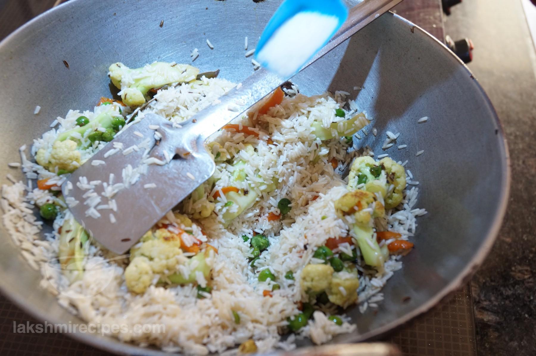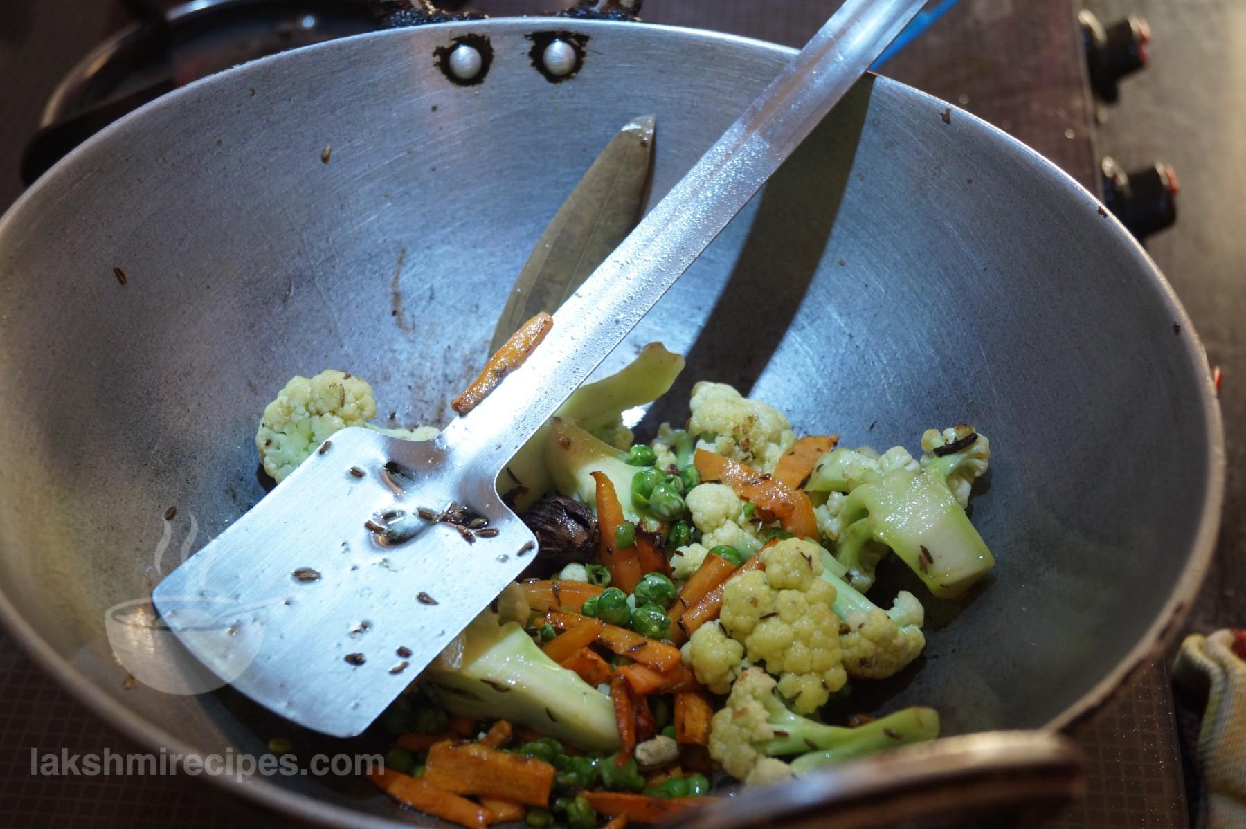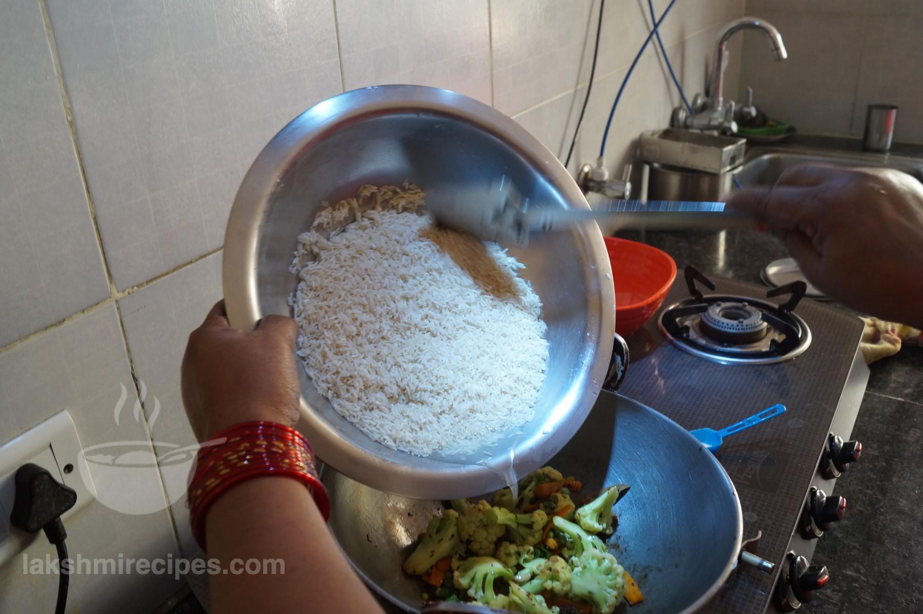 - When the vegetables appear golden red add the washed rice and mix all the ingredients.