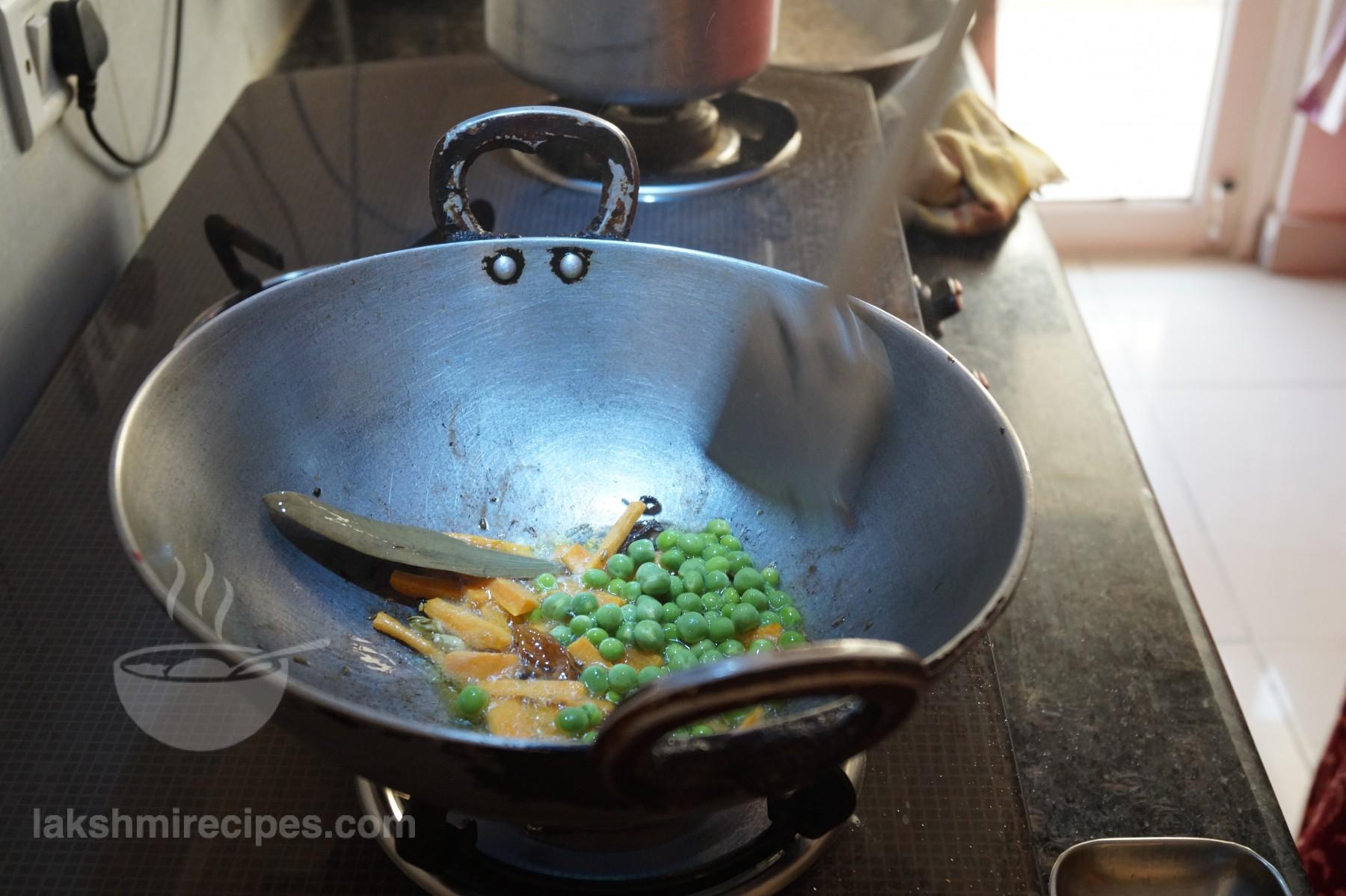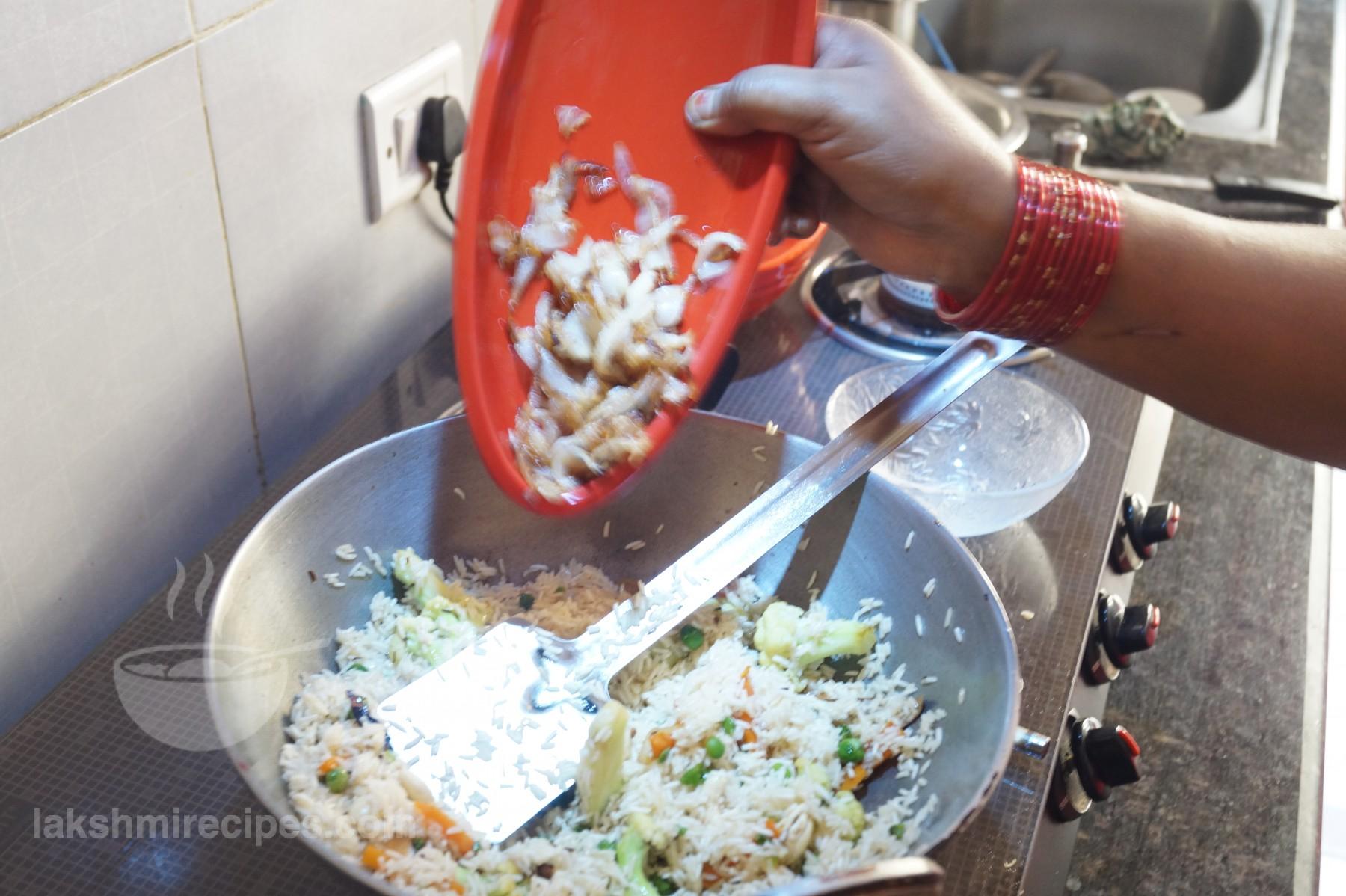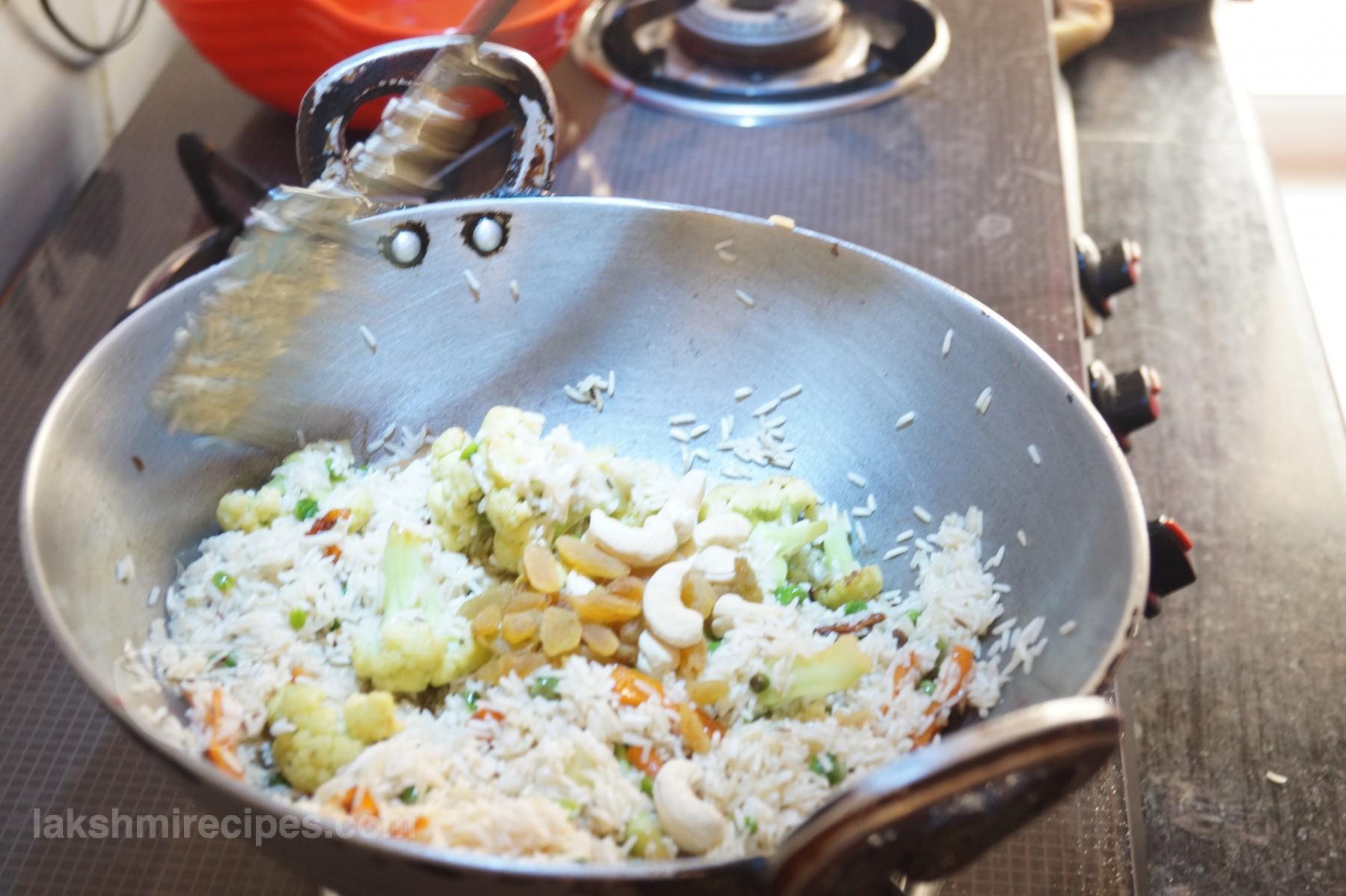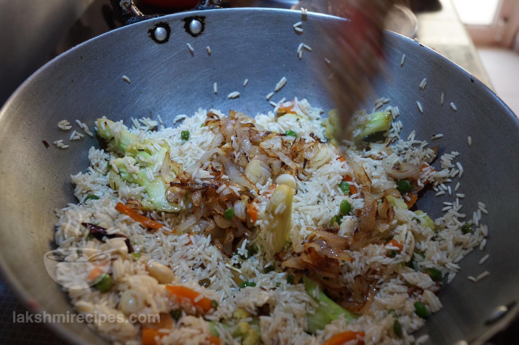 - When the vegetables appear golden red add the washed rice and mix all the ingredients.