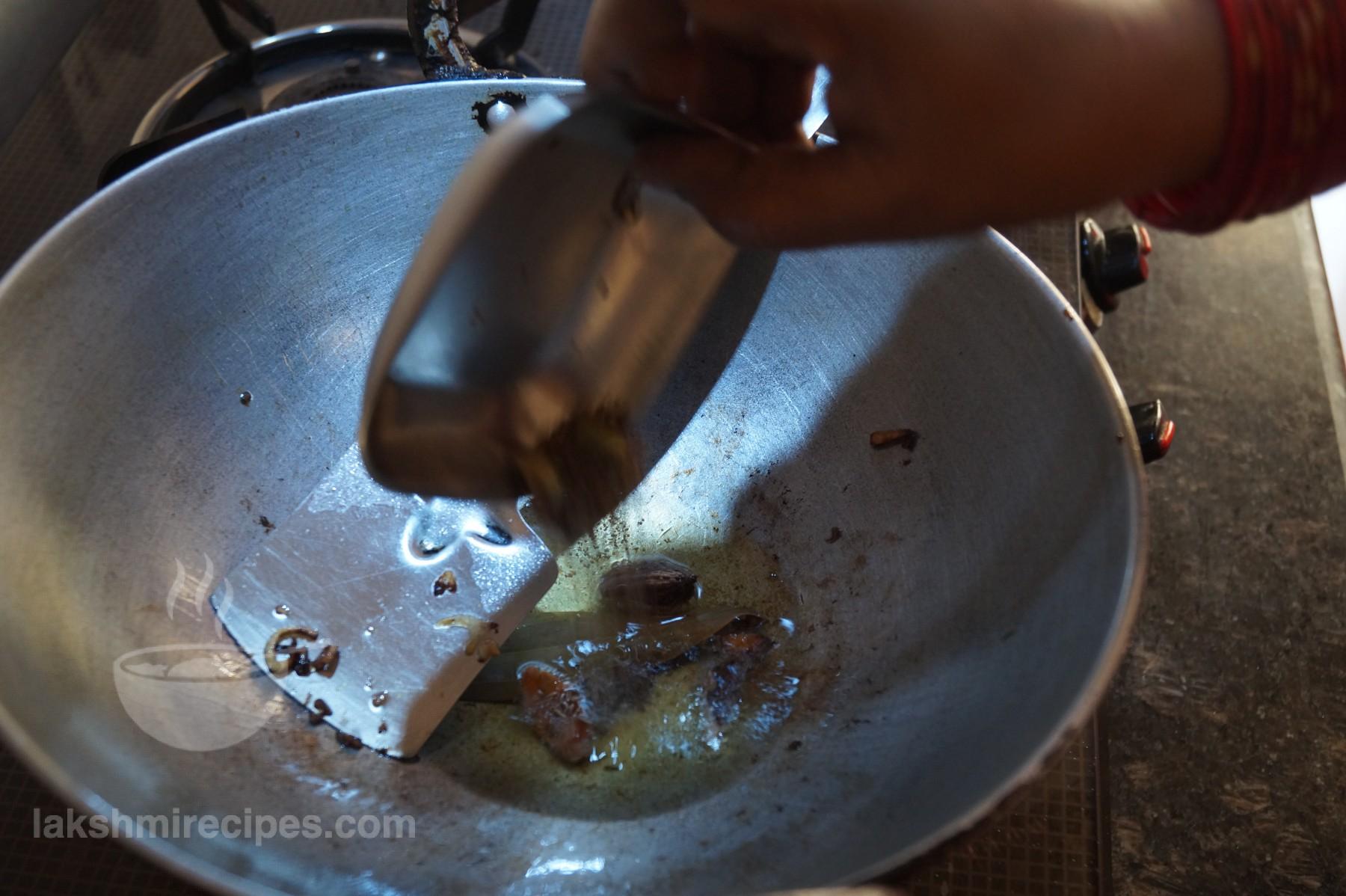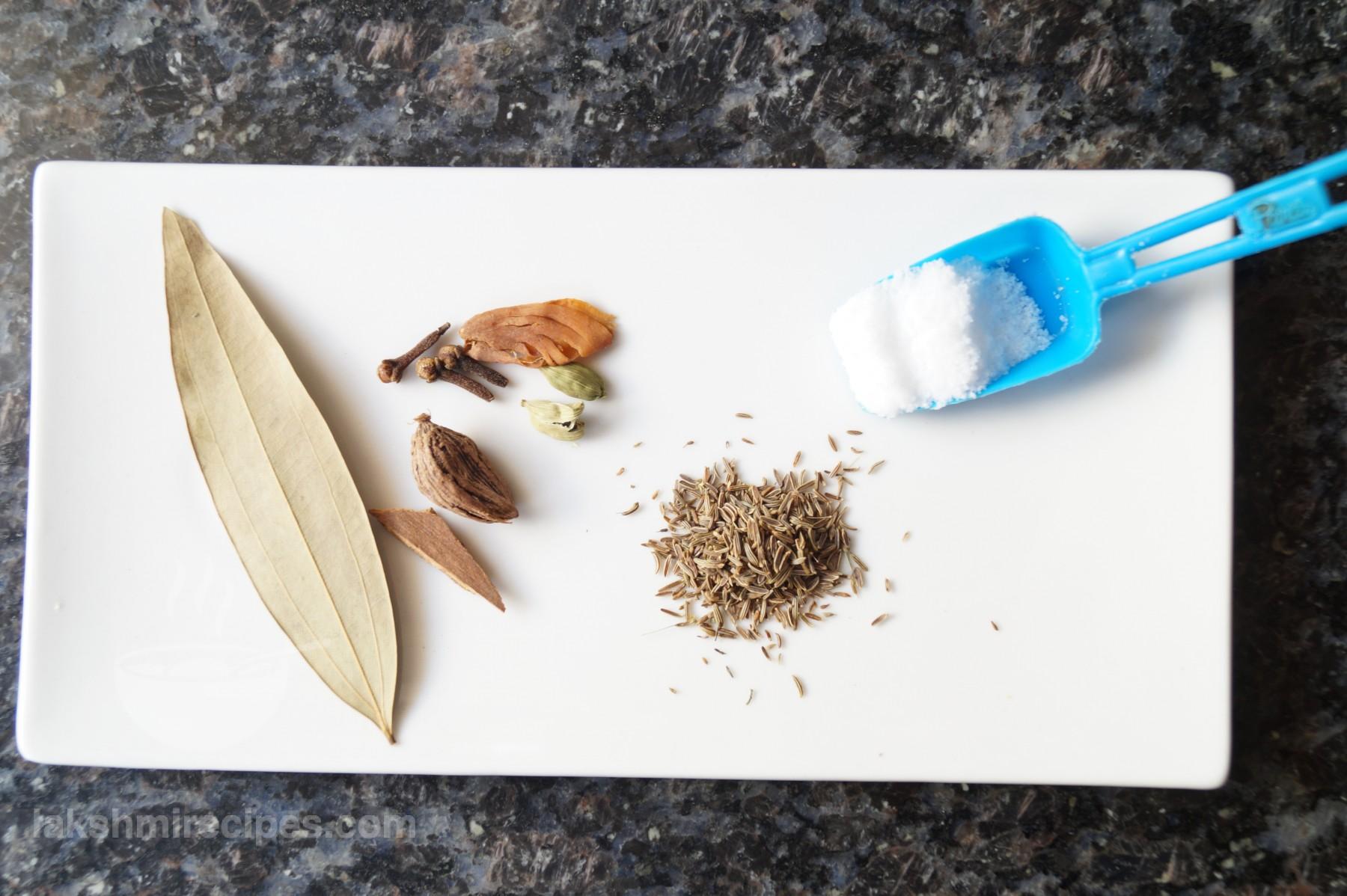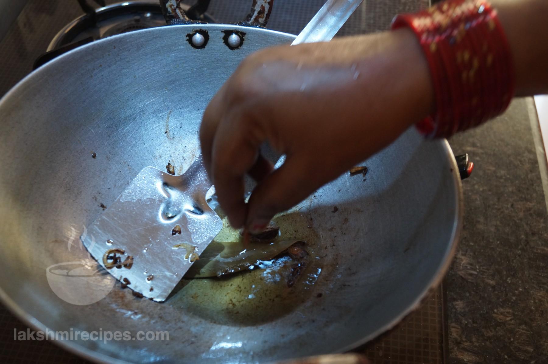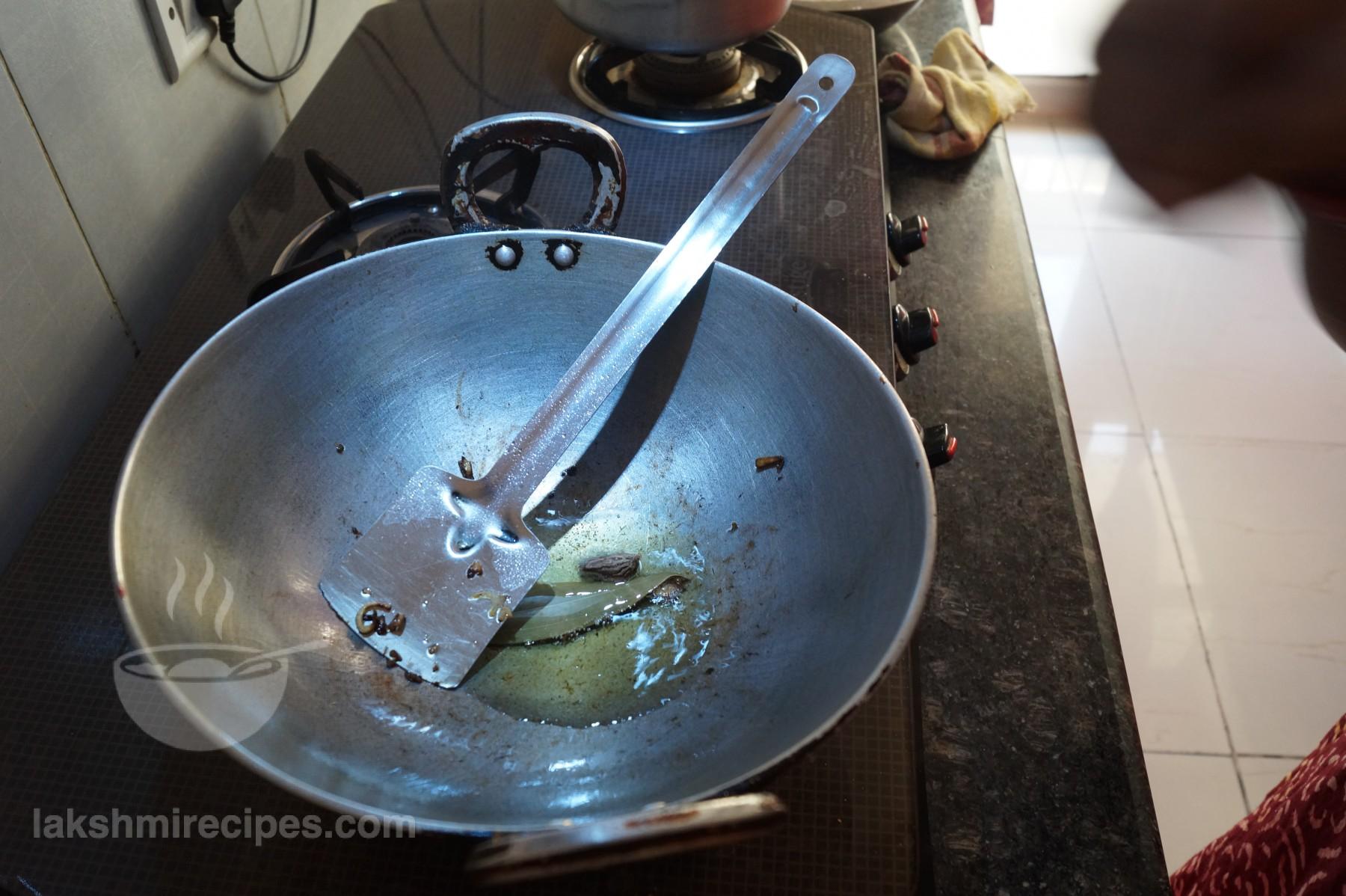 - To the same kadhai and heated ghee add the whole spices (tej patta, cloves (laung), shah jeera, big cardamom (badi elaichi) and small cardamoms (chhoti elaichi)) and saute them on medium flame.