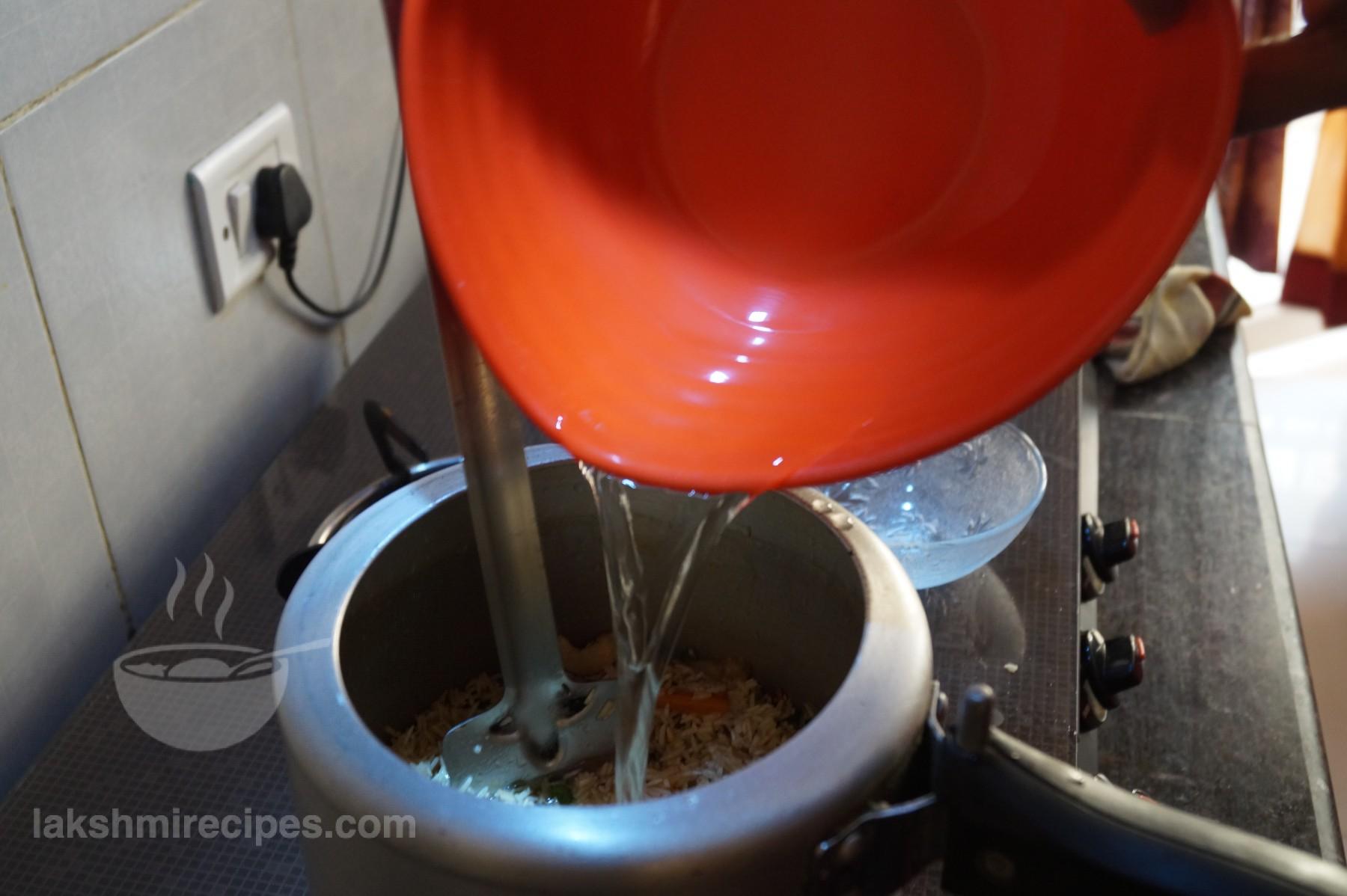 - Transfer all the ingredients of the kadhai to a pressure cooker and add water.