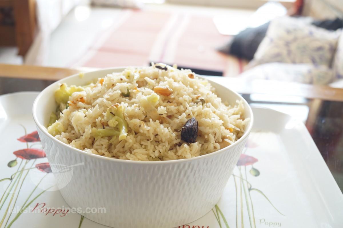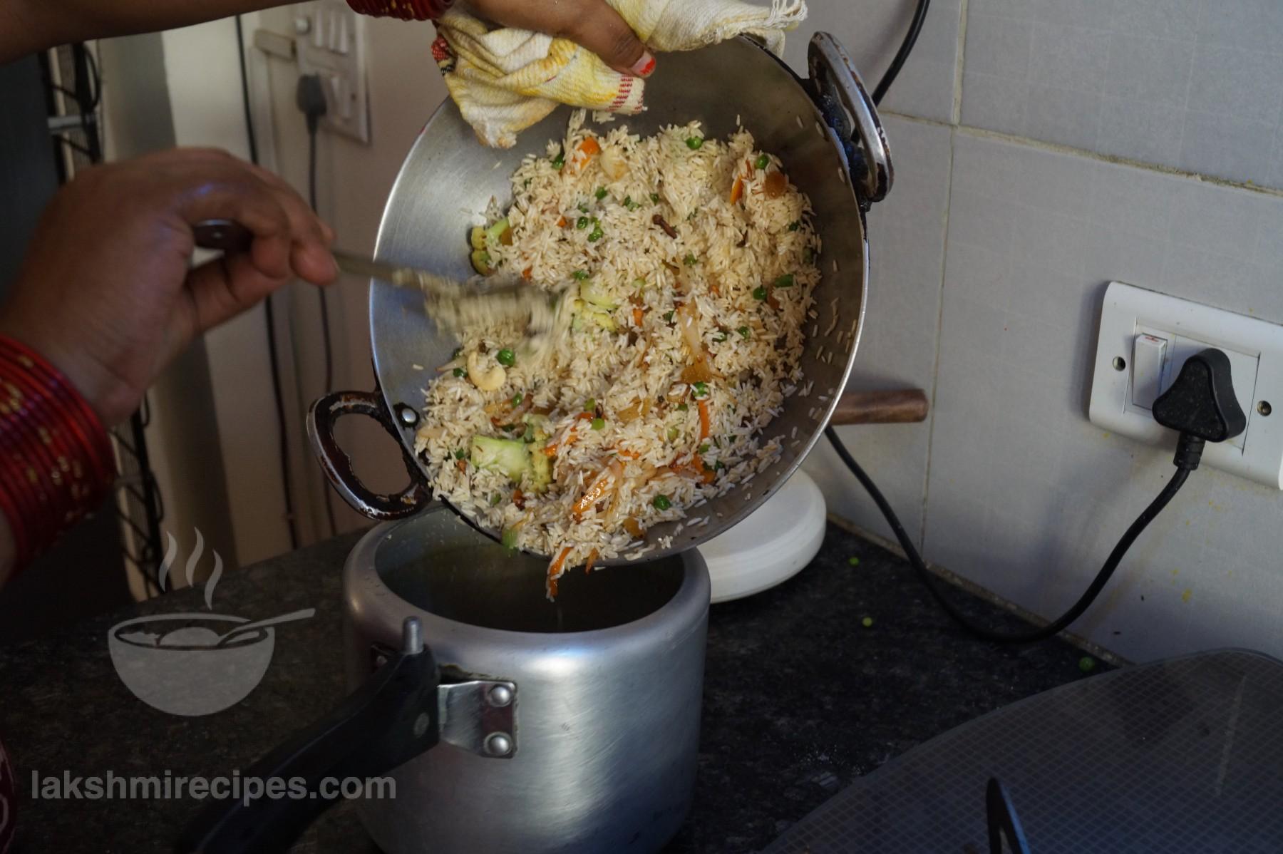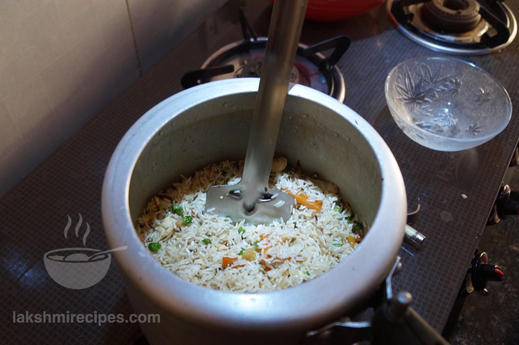 - Wait till the cooker cools and then serve the fried rice hot with raita or plain curd.