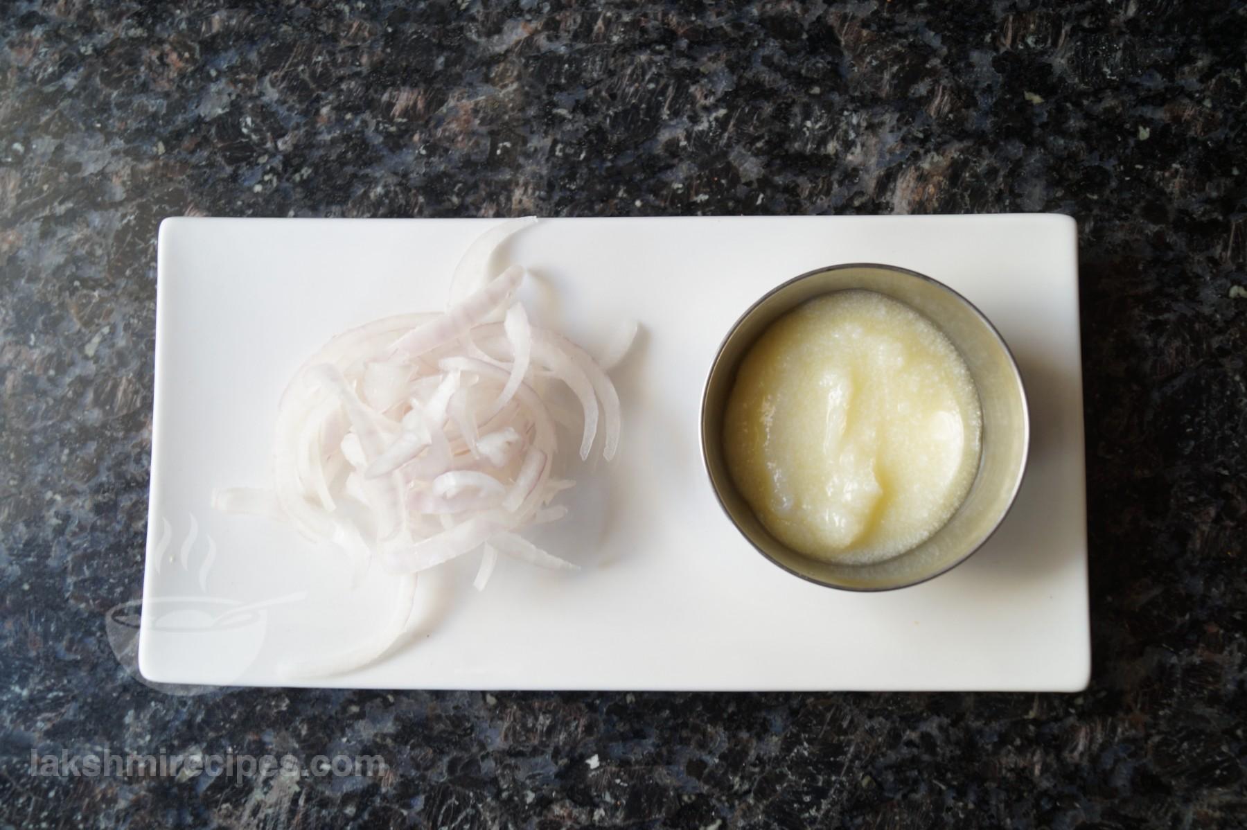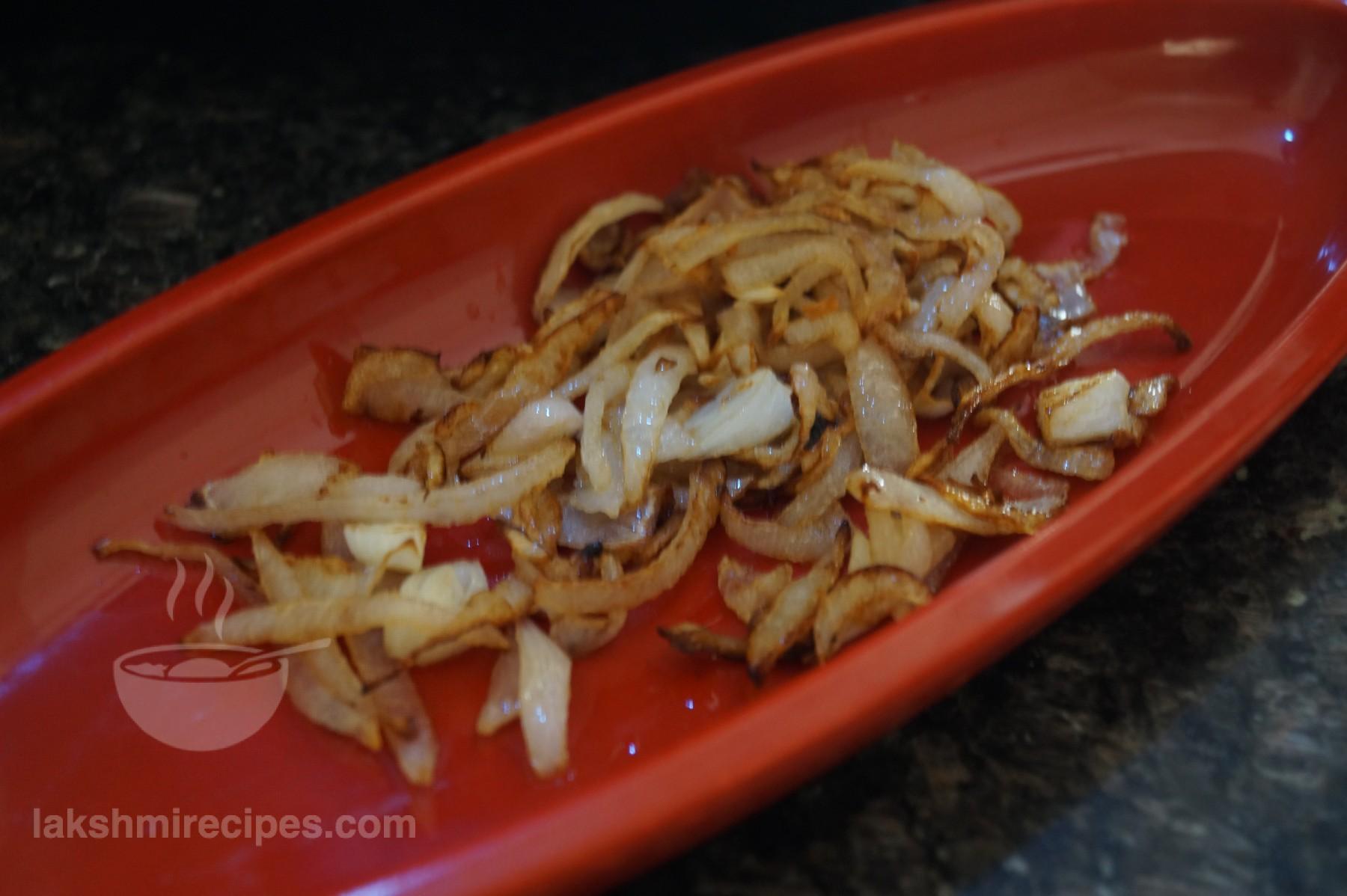 - Saute the onion (pyaz) till it turns golden red and transfer to a plate.