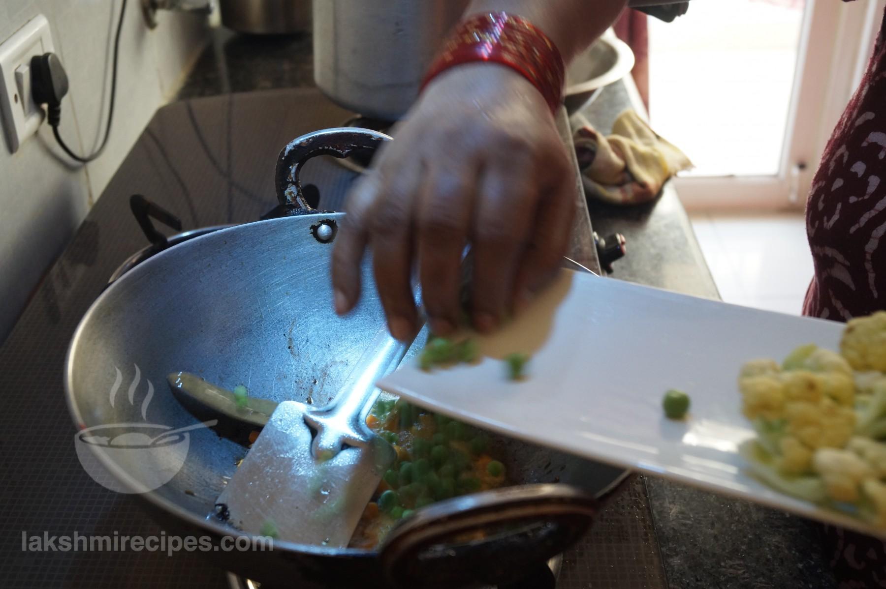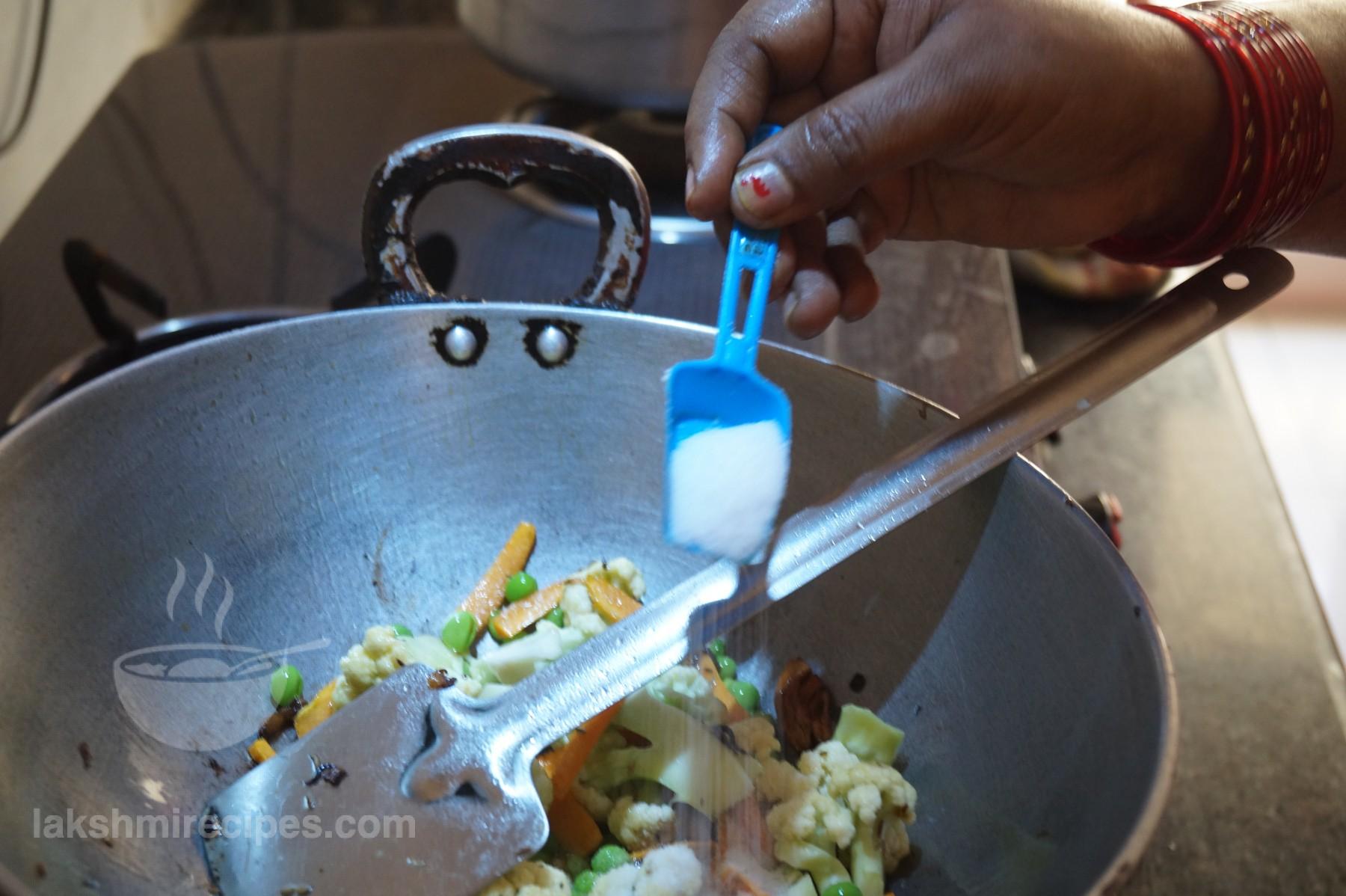 - Add salt to taste, lower the flame and cover the kadhai to cook the vegetables for 2 minutes.