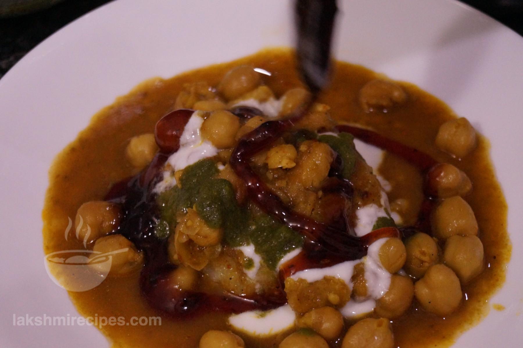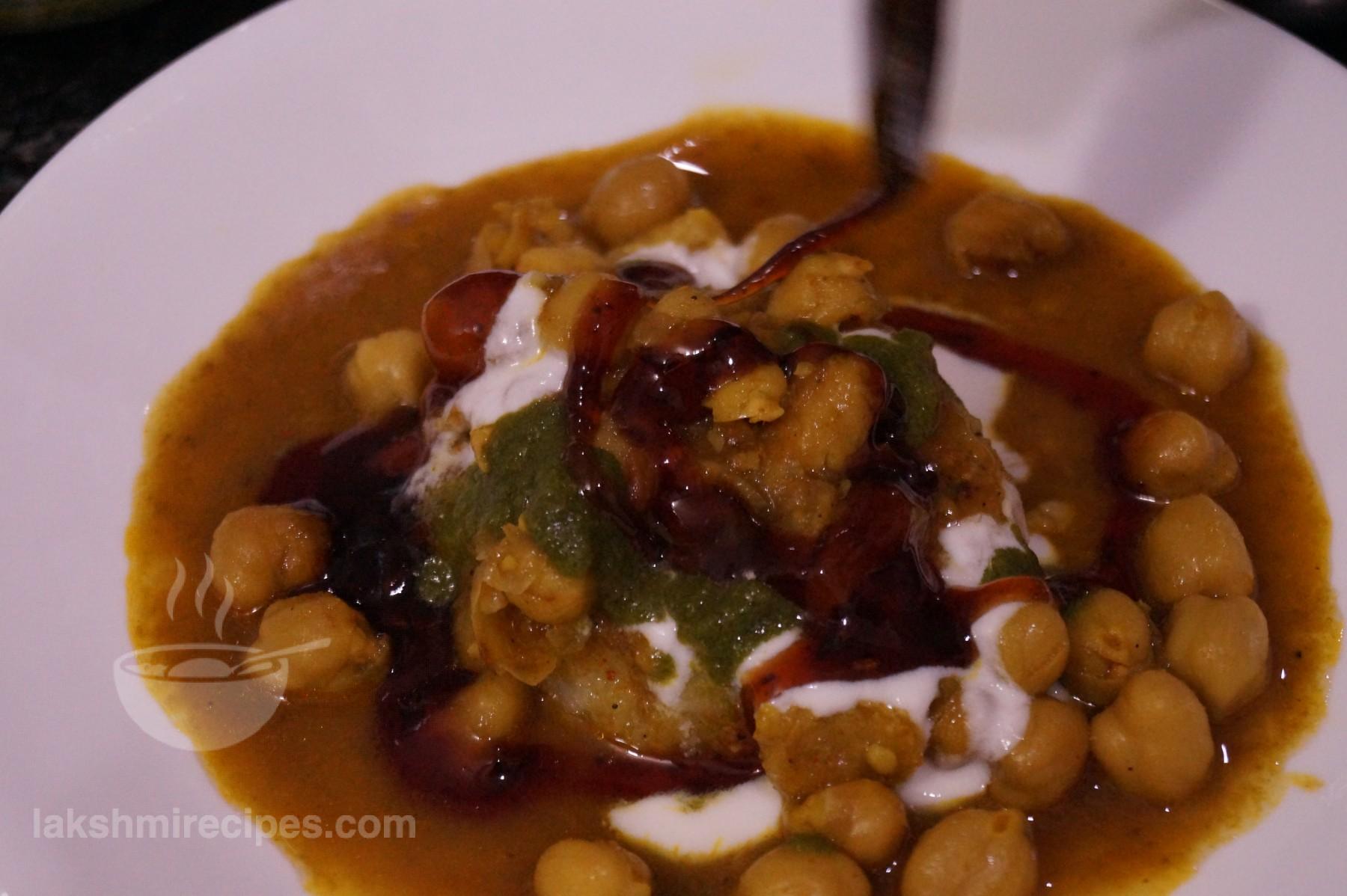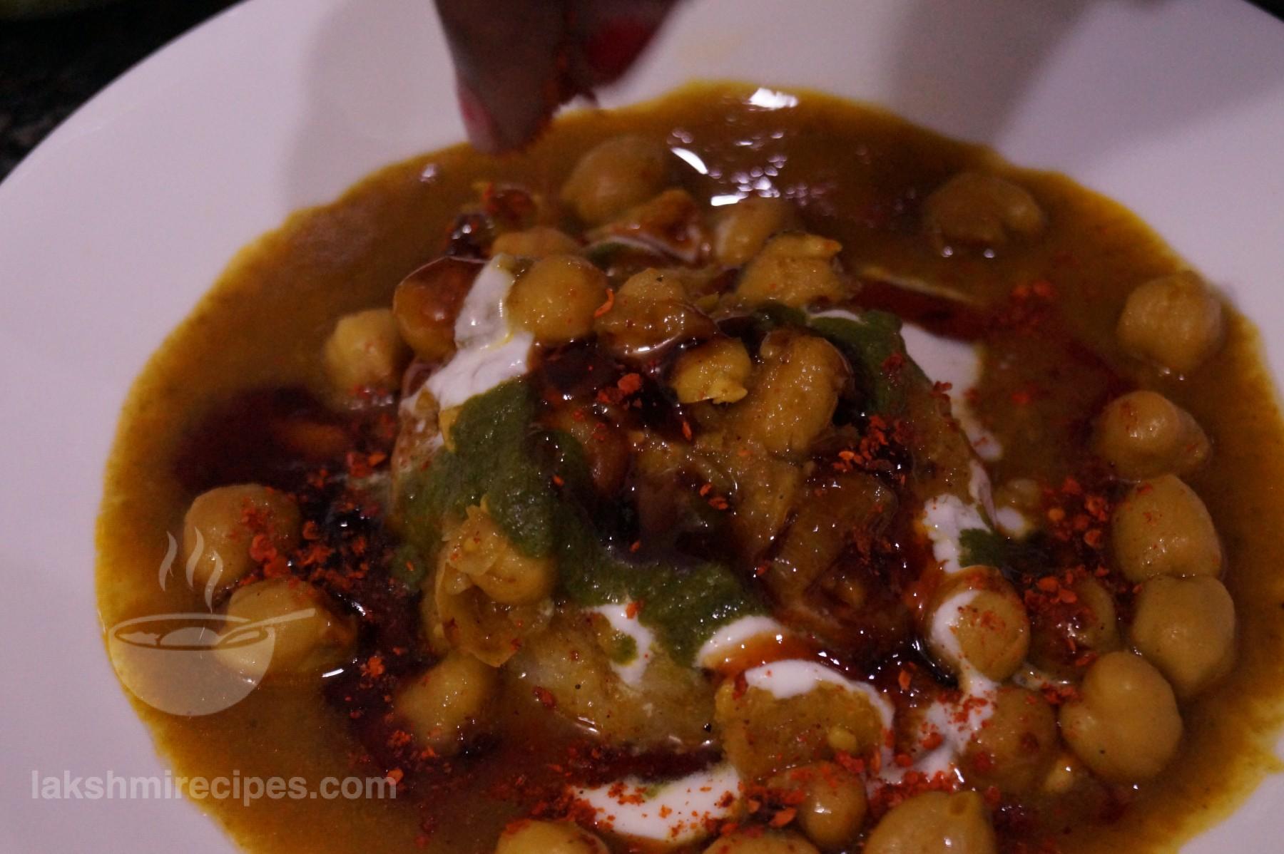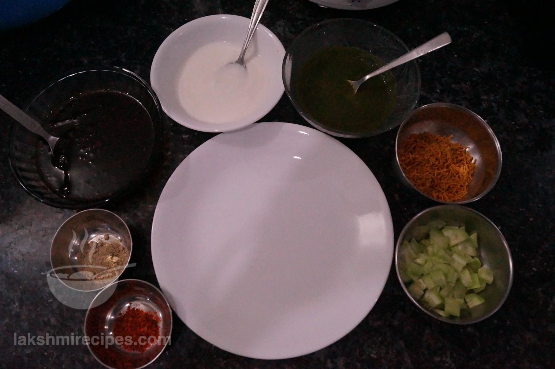 - Now pour some smoothened curd (dahi), tamarind chutney (imli ki cutney) and coriander chutney (hara dhaniya ki chutney) over it.