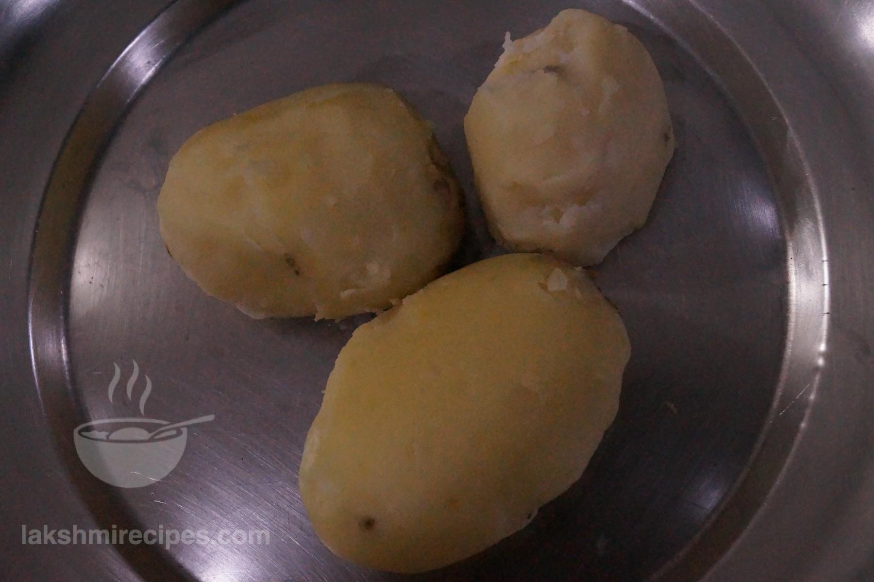 - Wash the potatoes well and boil them in a pressure cooker for 2 whistles. (Lower the flame after the first whistle)