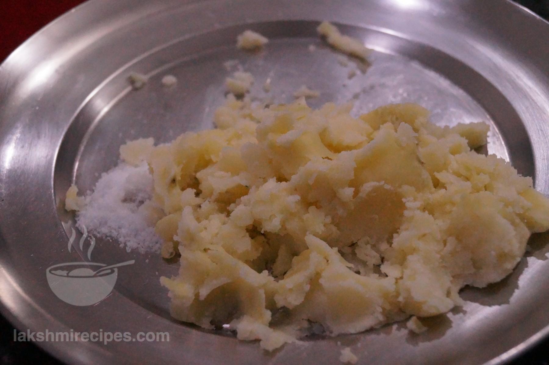 - Add the cornflour to the mashed potatoes and salt to taste.