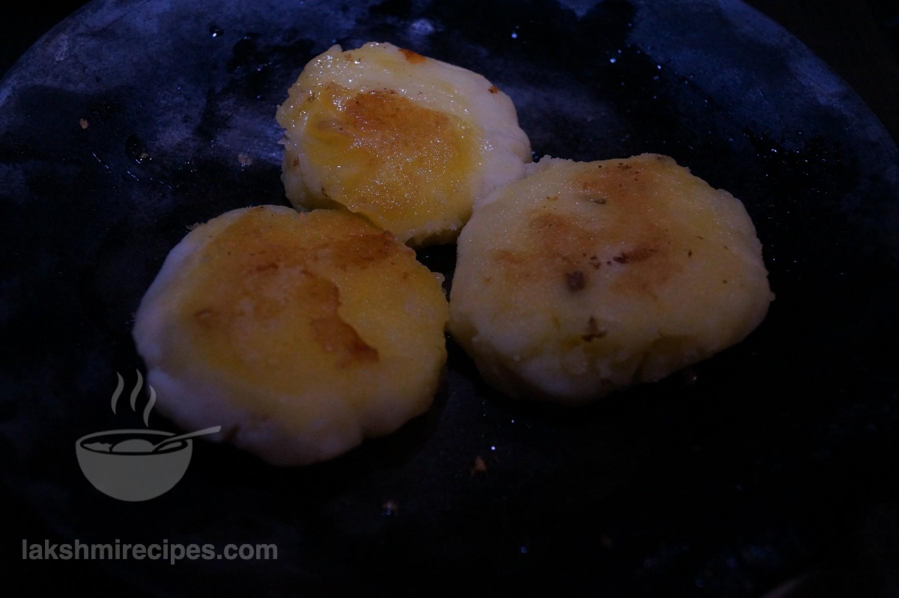 - In a non-stick pan or tawa heat some mustard oil (sarson ka tel) to stir fry the aloo tikkis.