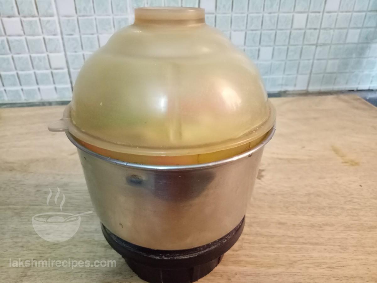 - Add ginger, garlic petals and green chilli to the mixer jar and grind the ingredients together to form a granular mixture.