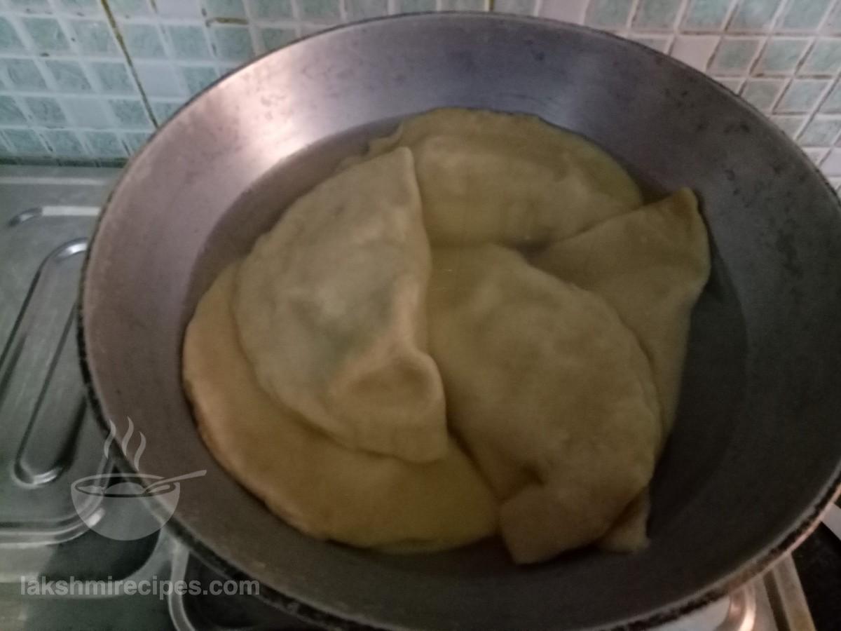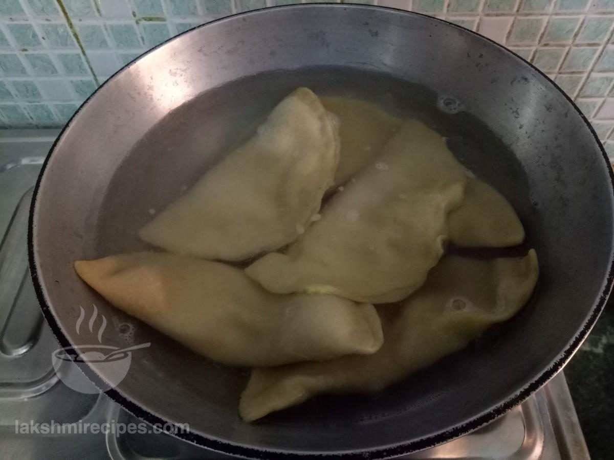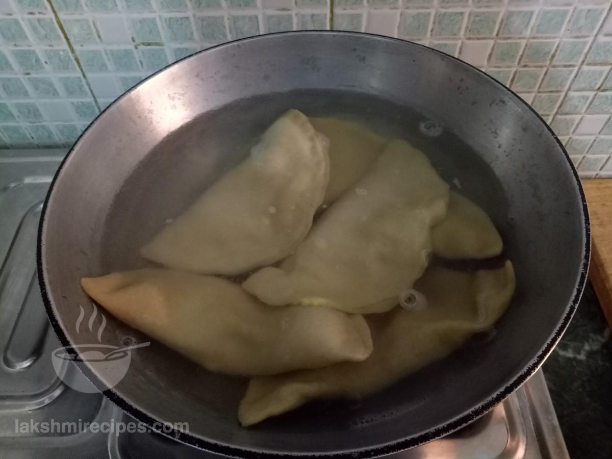 - Now take a deep vessel or big kadhai and fill it will water. The amount of water should be enough so that the pitha are completely submerged in it while boiling.