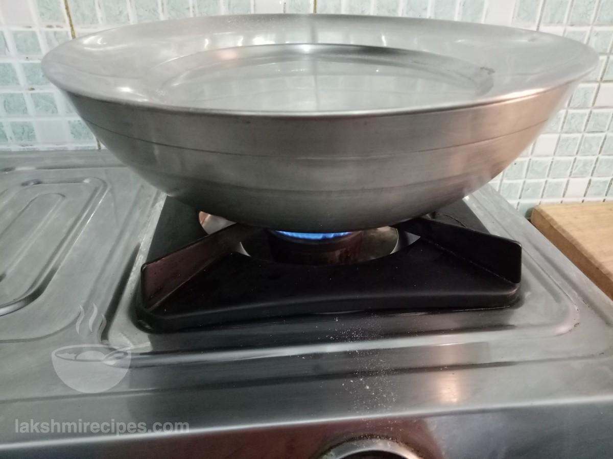 - Remove the lid once or twice in between and stir the pitha using a ladle, so that they do not stick to the base of the vessel or to each other.