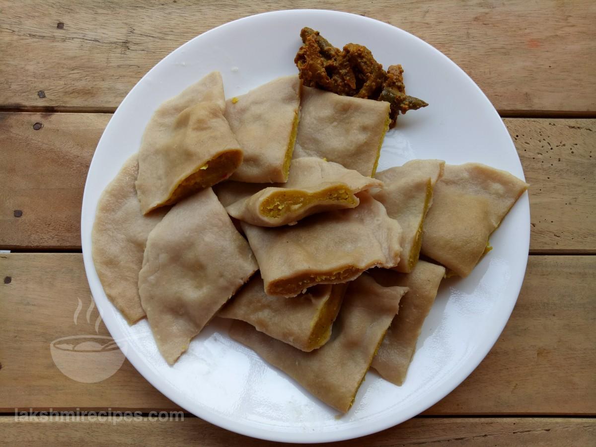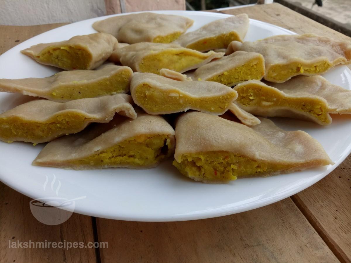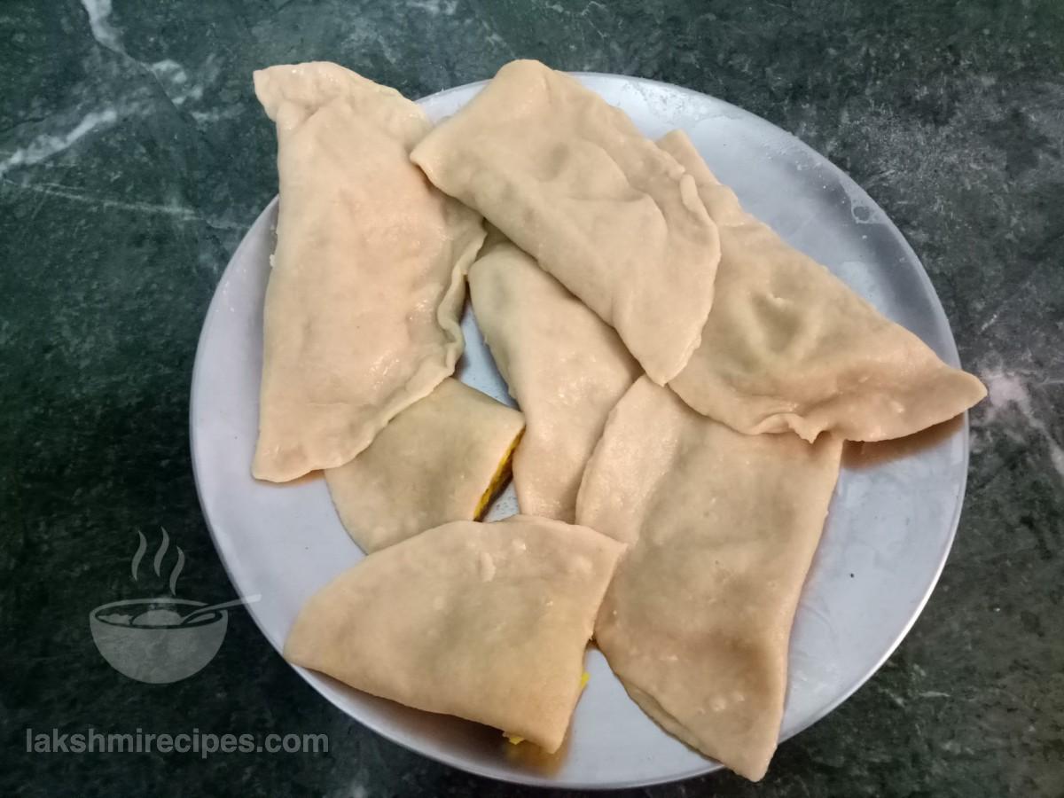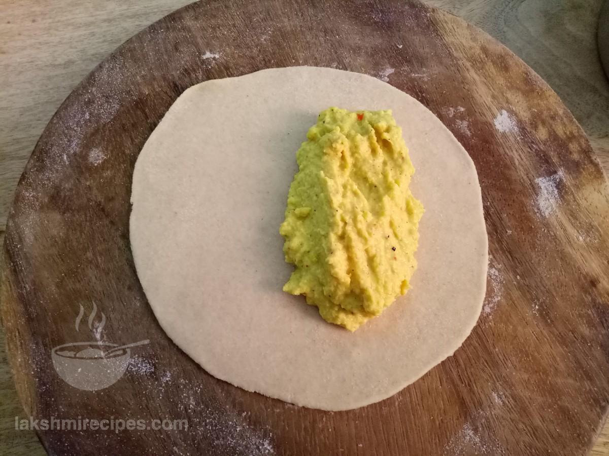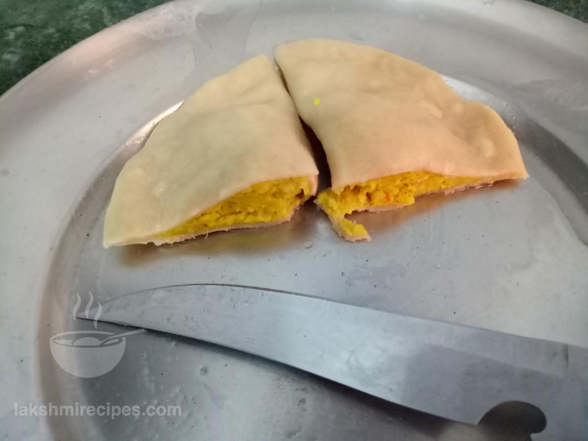 - फिर इसके बीच में थोड़ी चना दाल की स्टफिंग रखें और दोनों किनारों को एक साथ लाकर एक साथ चिपका लें (जैसा कि नीचे की छवि में दिखाया गया है)। बाकि आटे का पिठा भी इसी तरह तैयार करें।