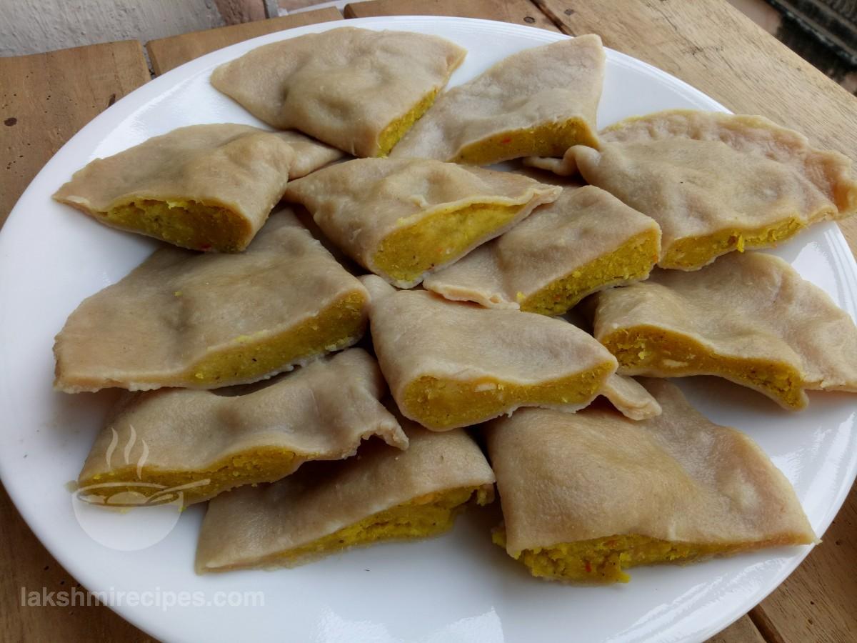- Then place some Bengal Gram Stuffing or the Chana Dal Stuffing at its centre and bring the sides together for binding to form a semi-circular dumpling (as shown in the image below). Prepare all the dumplings or atta ka pitha in the same way.
