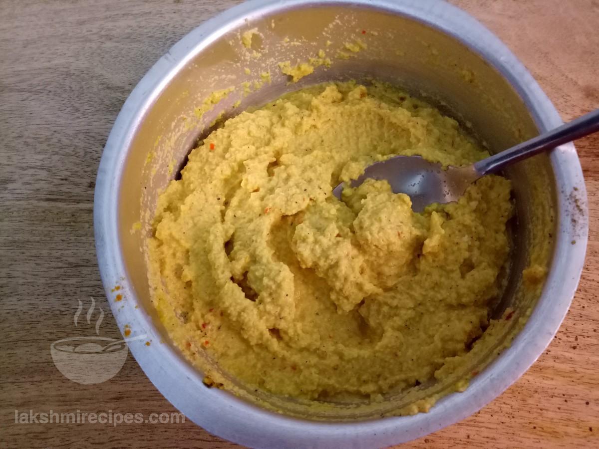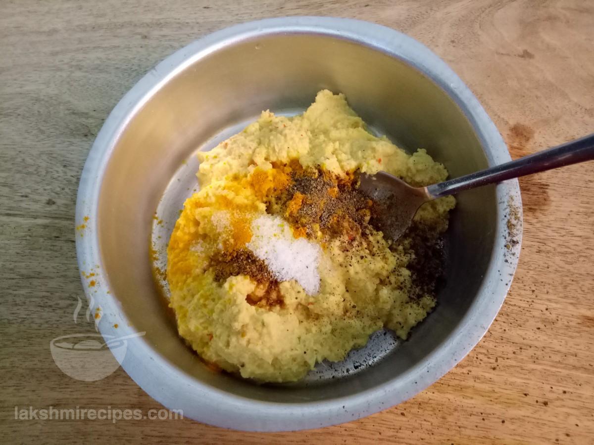 - इस पेस्ट को प्लेट में निकाल लें और इसमें नमक, हल्दी पाउडर, जीरा पाउडर और काली मिर्च पाउडर जोड़ें। सारी सामग्री को अच्छी तरह मिलाएं और आपकी चना दाल की स्टफिंग तैयार है।