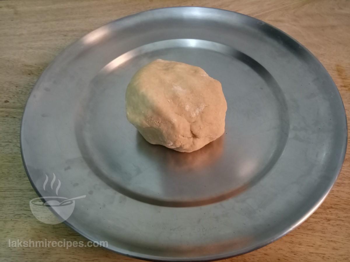 - Start kneading a soft dough of the whole wheat flour. The dough should be same as the dough made for making whole wheat chapatis. Then keep the dough aside while you prepare the stuffing for atta ka pitha.