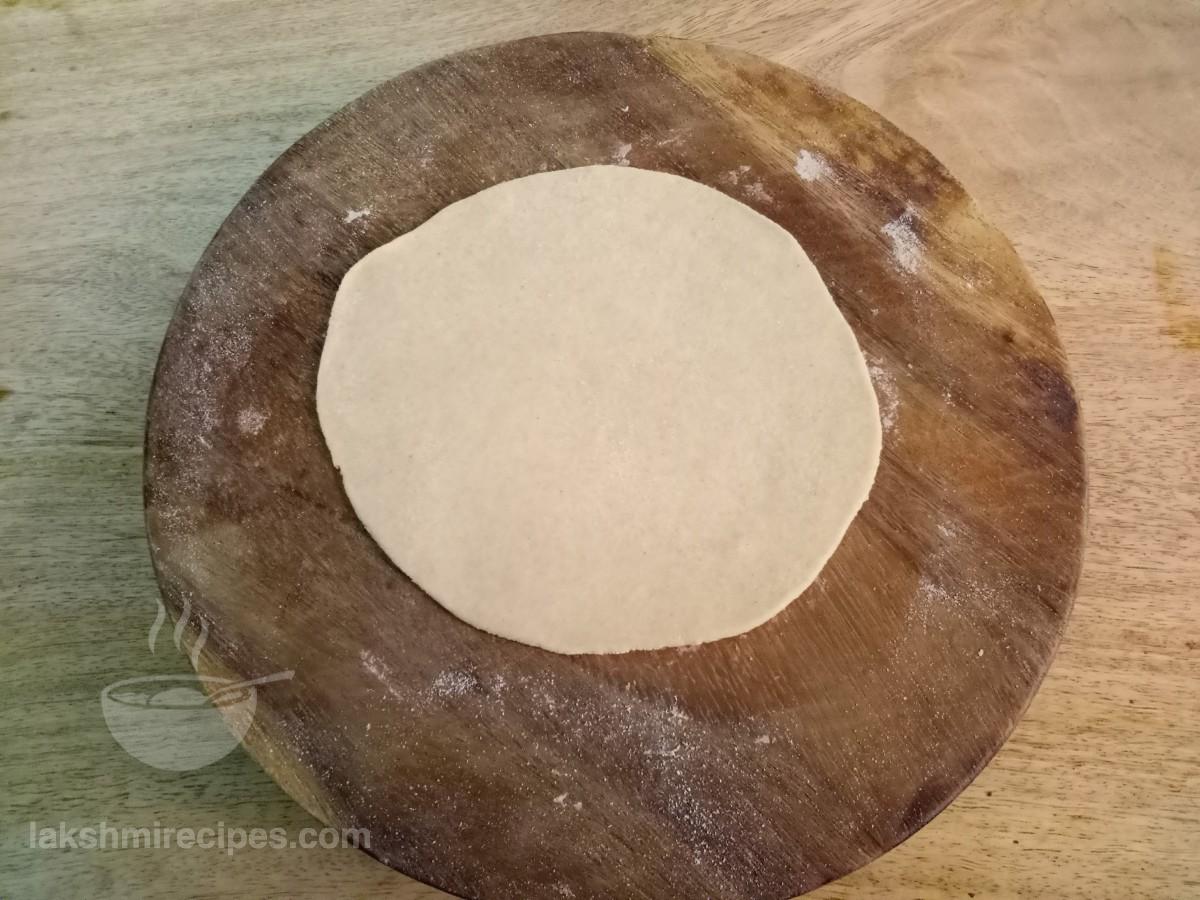 - अब एक लोई लें और थोड़ा सूखा गेहूं का आटा छिड़क कर लोई को चपाती की तरह बेल लें।