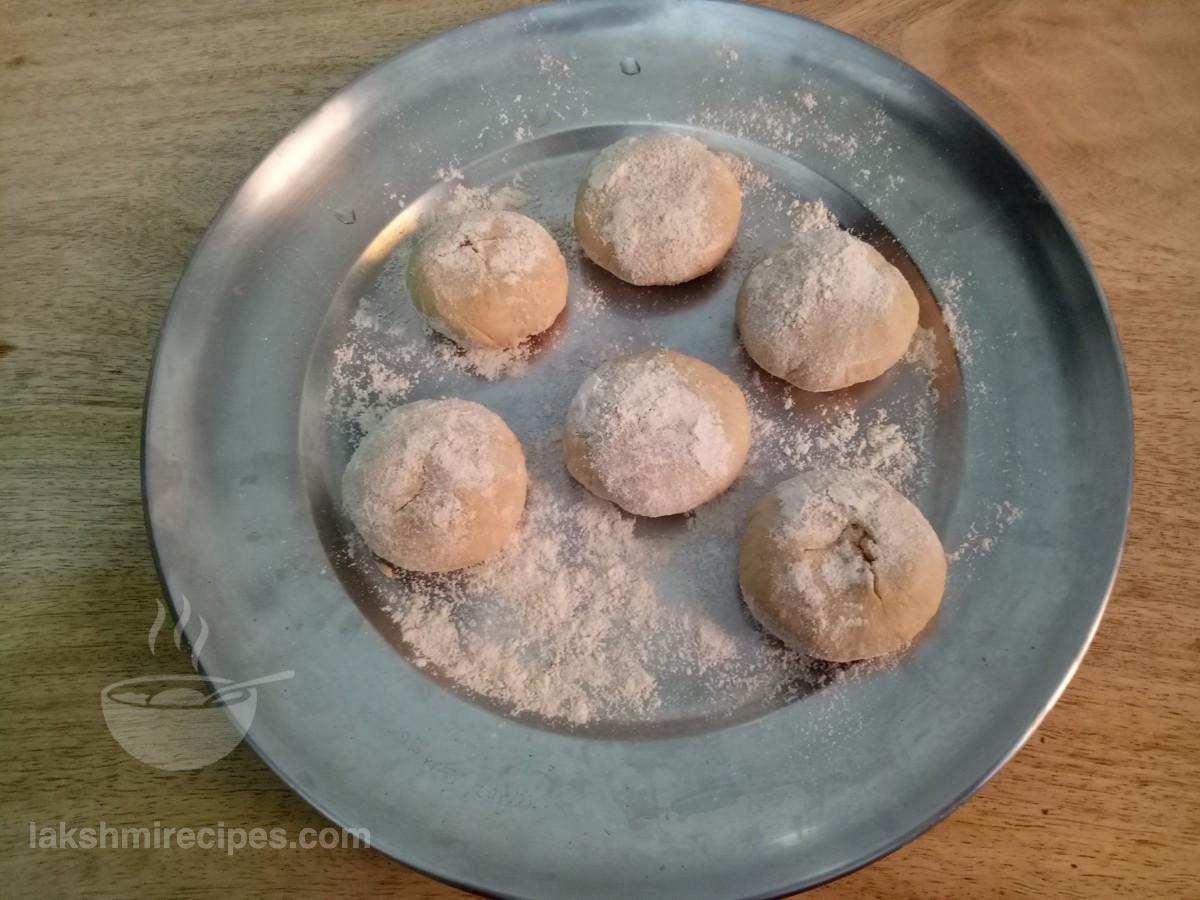 - फिर गेहूं का आटा लें और इसकी छोटी-छोटी लोई बना लें। लोई का आकार नींबू के आकार के समान होना चाहिए। सारी लोई को हाथों से चिकना कर लें।