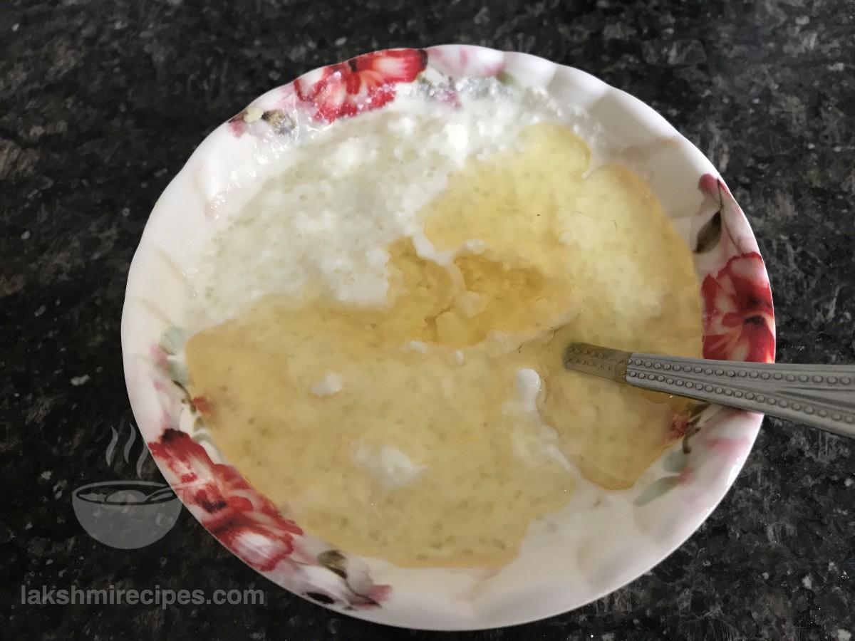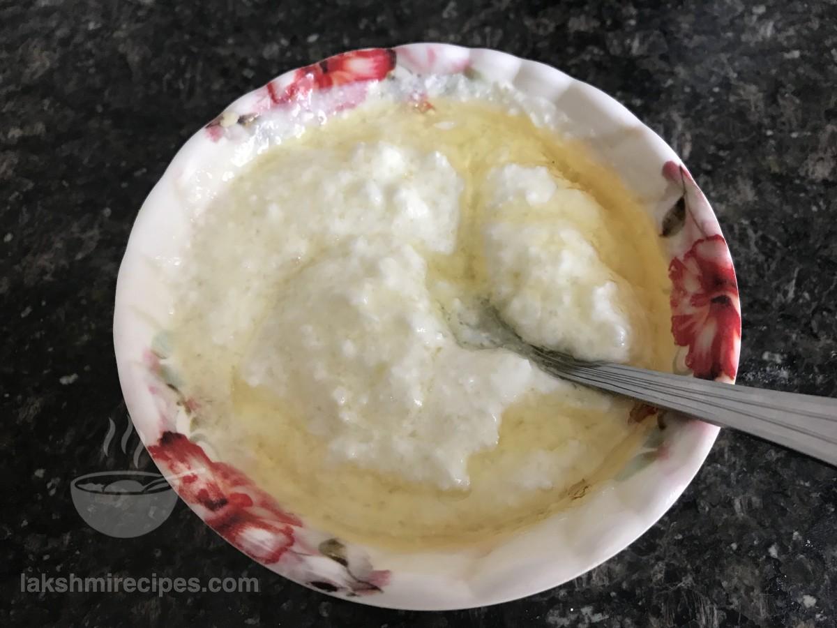 - Then add refined oil to the sweetened curd and whisk again to form a uniform solution of sweetened curd and refined oil.