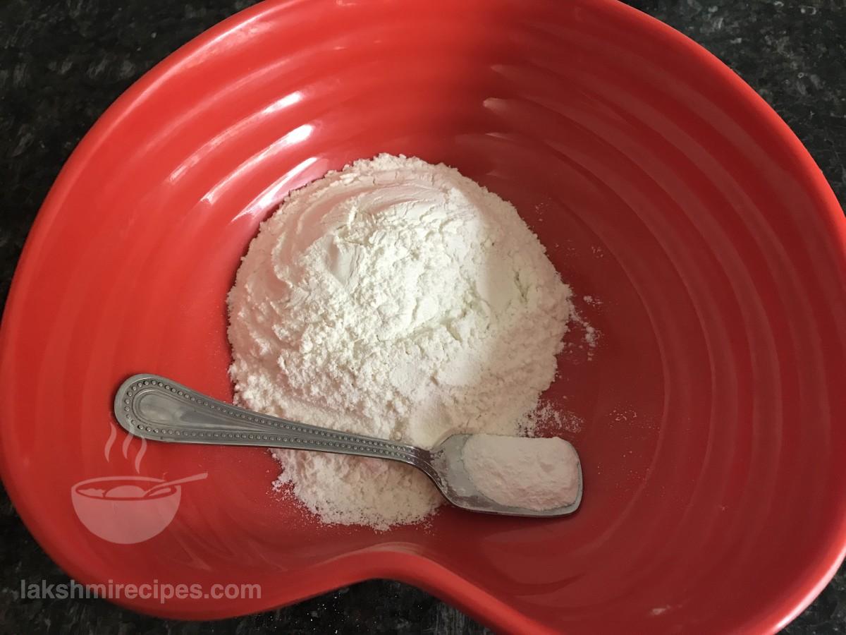 - In a big plate or mixing bowl take all purpose flour and add baking powder to it. Mix the dry ingredients well together.