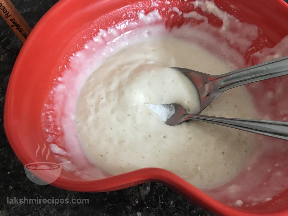 - When the batter is ready add 1/2 tea spoon baking soda to it. As soon as you add baking soda to the pancake batter you will notice the formation of some air bubbles. Mix the baking soda with the pancake batter.