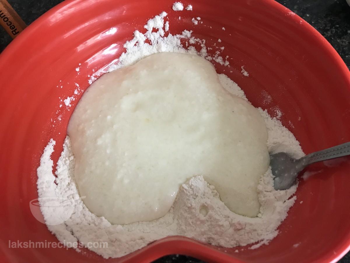 - अब इस मिठे दही और रिफाइंड तेल के घोल को मैदे और बेकिंग पाउडर के सूखे मिश्रण में डालें।