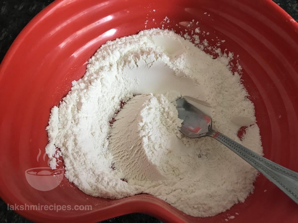 - एक बड़ी प्लेट या मिक्सिंग कटोरे में सभी मैदा और इसमें बेकिंग पाउडर डालें। दोनों सूखी सामग्री को अच्छी तरह से एक साथ मिलाएं।