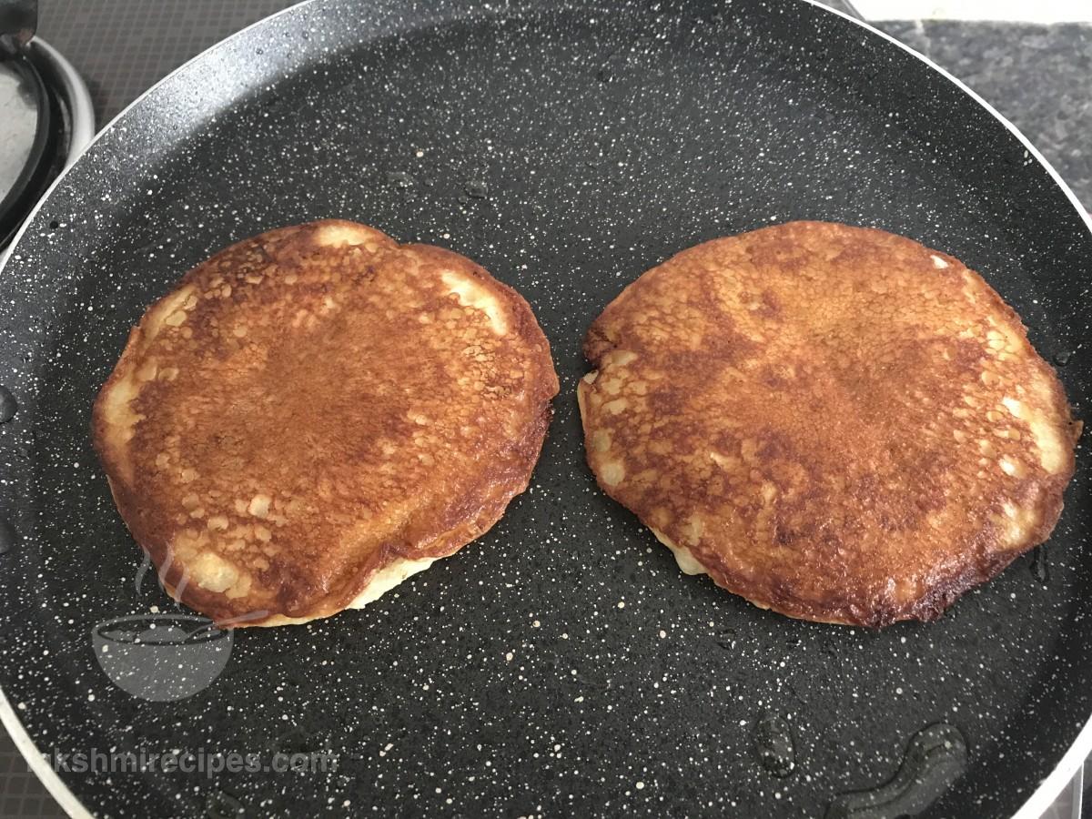 - Allow the pancakes to cook on one side for 3 minutes till it turns crispy red in color. Then flip all of them to cook in the same manner for 3 minutes on the other side as well. If required pour some oil or add butter to the tawa around the cooking pancakes.
