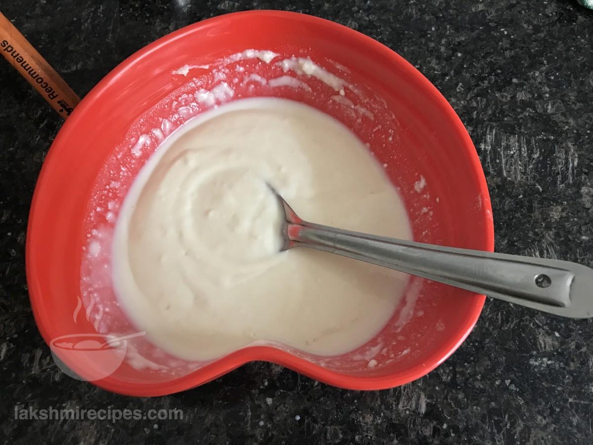 - In another vessel take curd and sugar. Whisk the two ingredients together so as to completely dissolve the sugar in the curd.