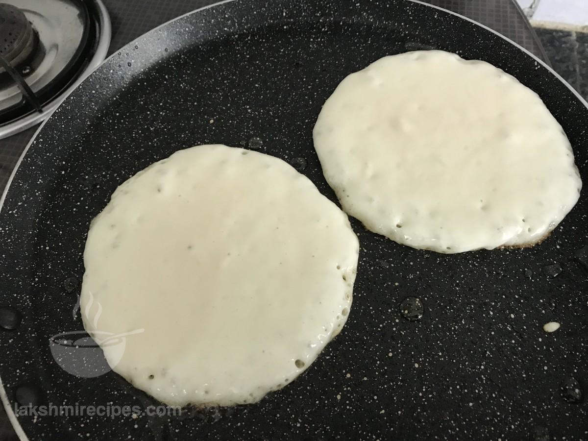 - Then take a round ladle and pour a ladle full pancake batter over the hot non-stick tawa. Allow the pancake batter to spread on its own into a round pancake. If you have a big non-stick tawa then you can make 2-3 pancakes at one time. (as hown in the images below.) Lower the flame to medium level as soon as you pour the pancake batter over the non-stick tawa