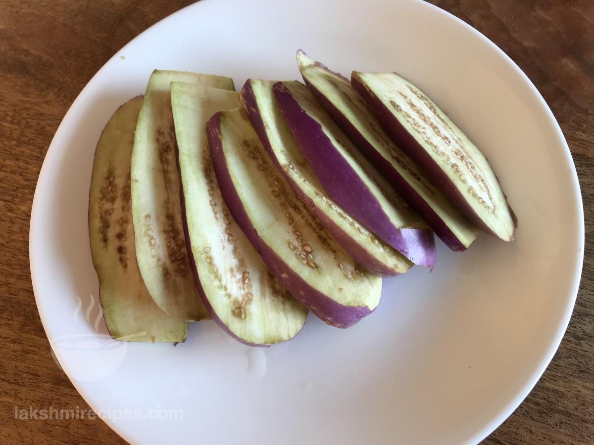 - Take the long variety of brinjals and wash them nicely with clean water. Then cut off the green stem and cut out long slices from it. The slices should be thina nd cut along the length.