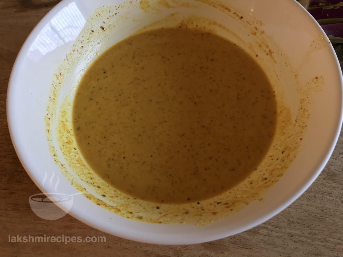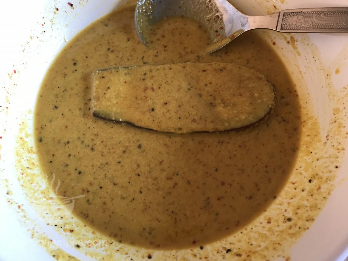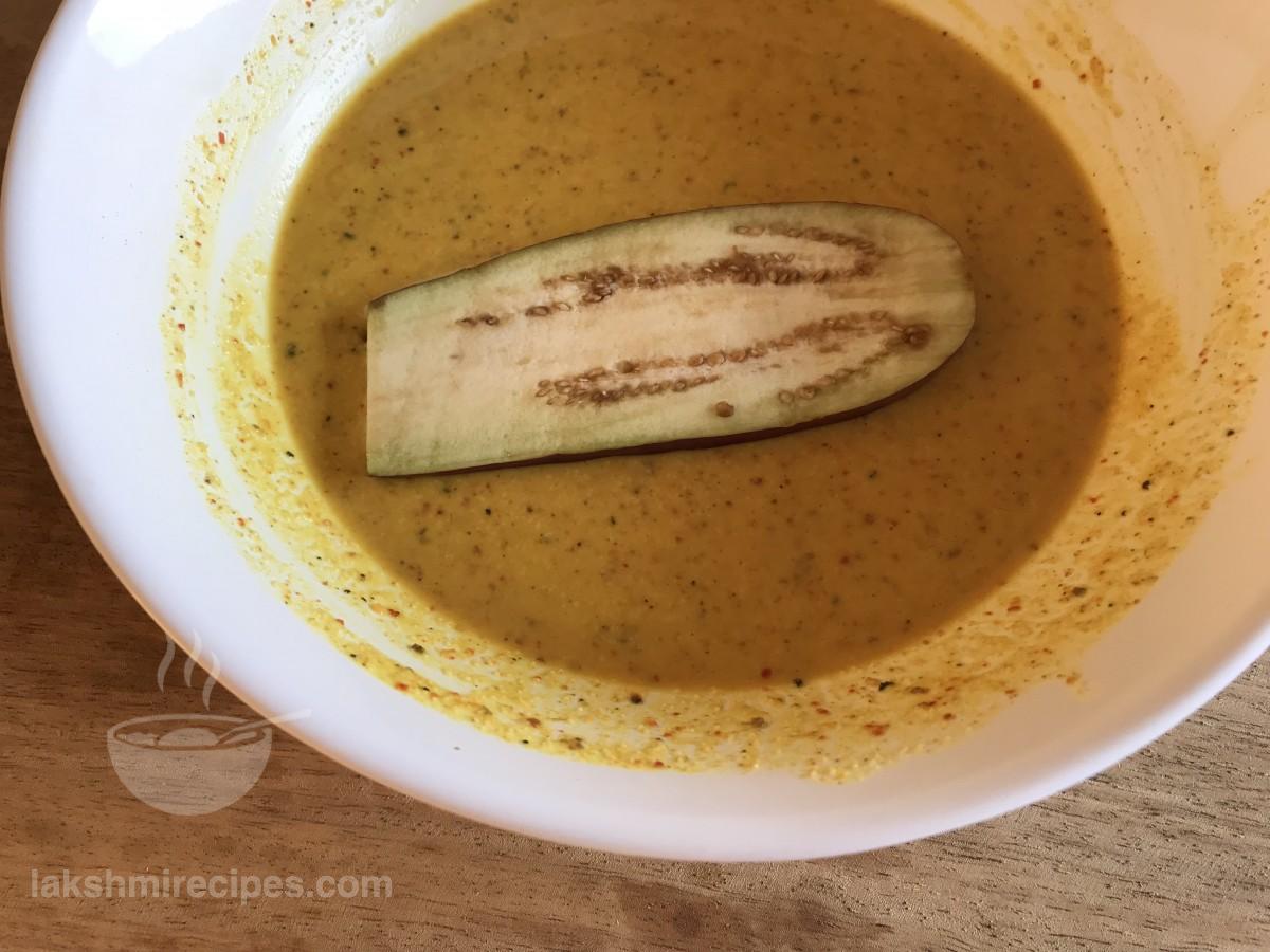- Take one brinjal slice and dip it in the batter prepared earlier. Dip it nicely so that the slice gets coated with the batter on all sides.