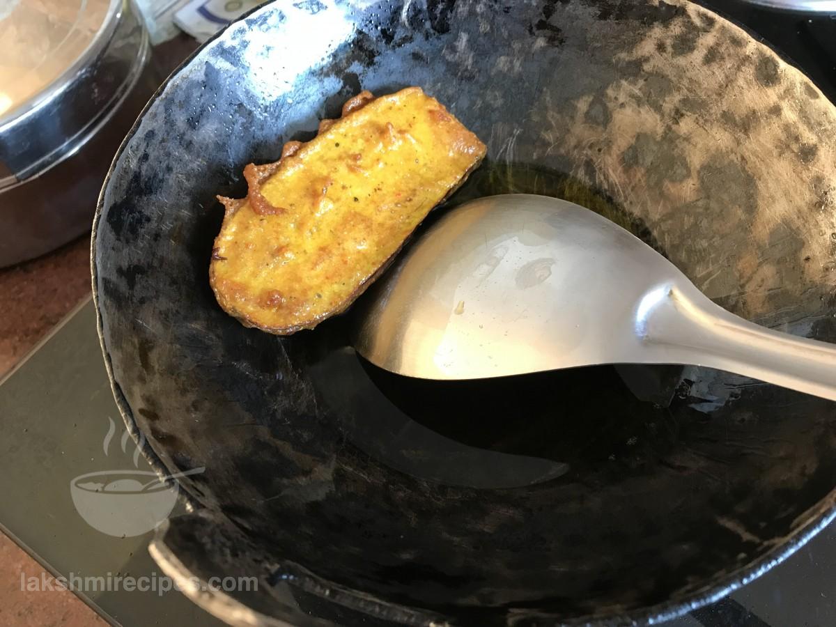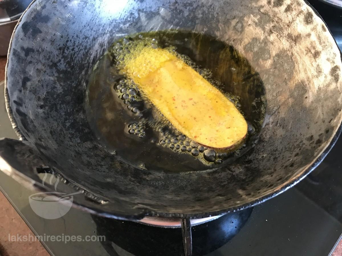- Then place the brinjal slice coated with batter into the kadhai for frying. If your kadhai is big in size then add 3-4 pieces of brinjal to fry at one time.